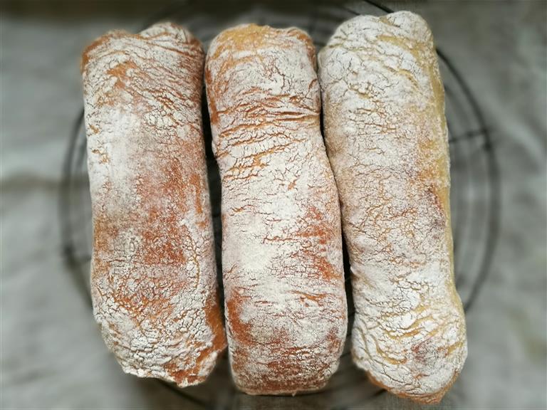 Chiabatta, heißt übersetzt Pantoffel und ist ein flaches, langgezogenes, italienisches Brot. Neben Baguette, Focaccia oder das einfache Fougasse mit Zitronenduft ist dies eines meiner Lieblingsformen für ein schnelles Weißbrot. Normalerweise wird bei Chiabatta ein Teil der Zutaten (ohne Salz) als Biga Vorteig hergestellt und dem Hauptteig zugegeben. Biga ist ein Teig aus 100g Mehl, 100g Wasser und 1g Hefe der nach 12-24 Stunden kühler Lagerung dem Hauptteil zugegeben wird. Dadurch wird der Teig stabiler und deutlich formbarer und dehnbarer ohne gleich die Gase zu verlieren. Mehr zu Vorteigen gibt es in unserem neuen Backbuch Backen mit Urkorn.