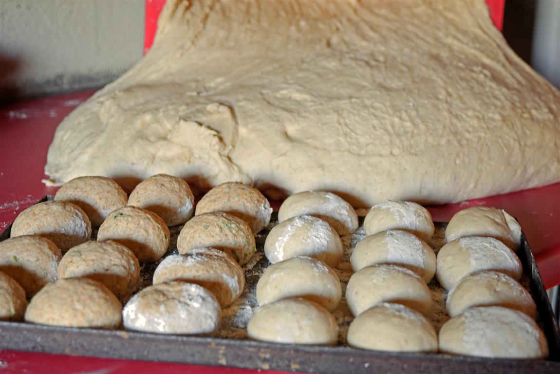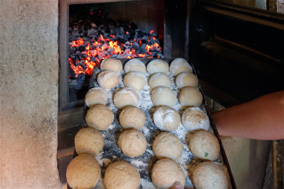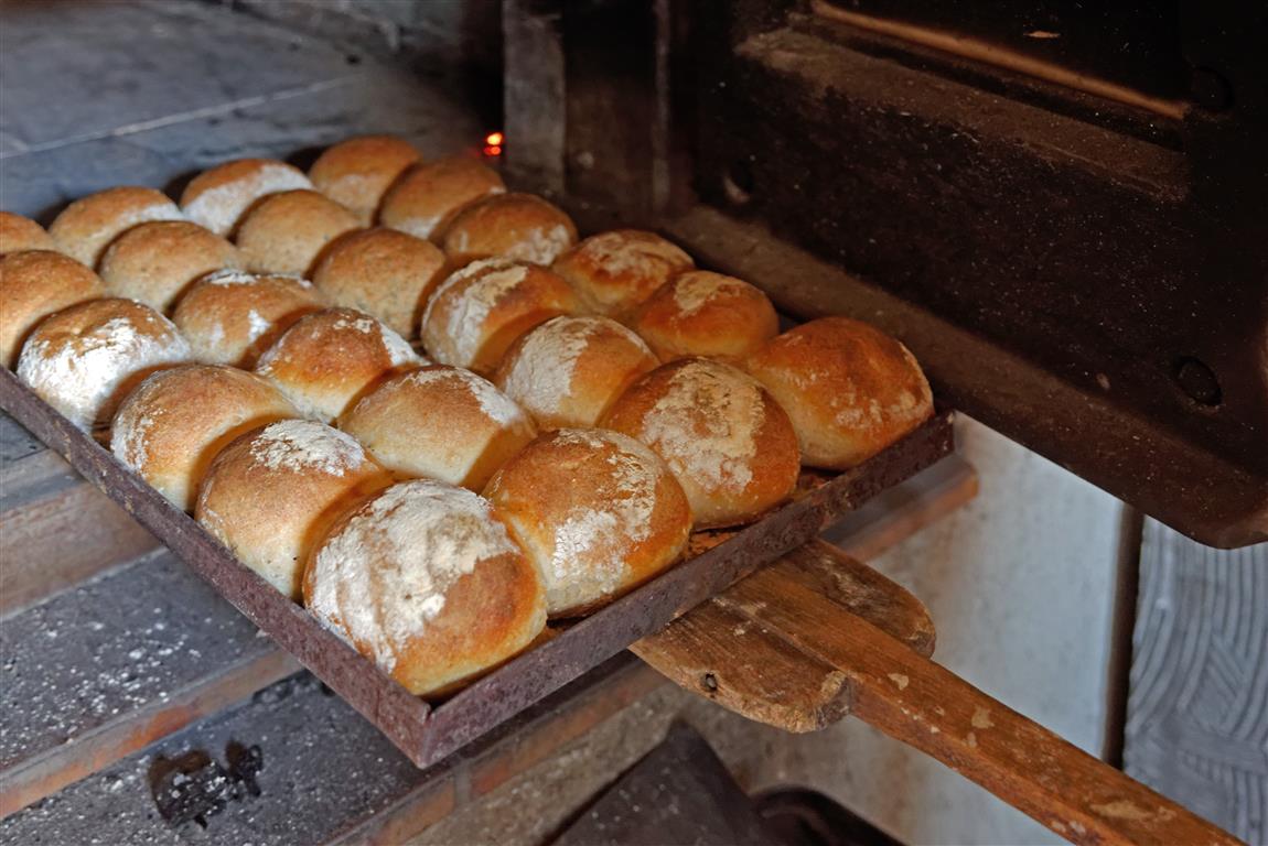 In einer der letzen Backgänge werden die Brötchen, die Nussstangen und manchmal auch süße Hefeschnecken eingeschossen. Für die Brötchen formt sie aus dem Brotteig kleine Brötchen zu je 80 g, die nicht sehr eng auf ein bemehltes Blech gesetzt werden. Nach 40 Minuten Ruhezeit sollten sie sich gerade eben berühren. Am Ende, kurz vor dem Einschießen, werden die Rohlinge leicht mit Mehl bestäubt und für 20 – 25 Minuten braun ausgebacken.