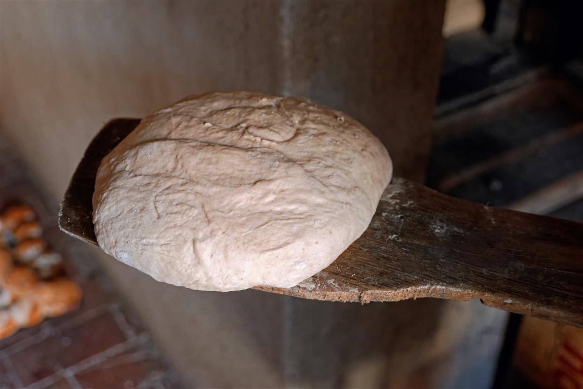 Als Hobbybäckerin hat Elke sich bereits vor rund 20 Jahren einen 1×2 m großen Holzbackofen im Nebengebäude mauern lassen. Ihr Getreide holt sie aus der Tantenmühle aus dem Nachbardorf Malsburg, oft in Bioqualität, um es zu Hause selbst zu mahlen. Ein Teil der Mehlmenge, vor allem der frisch gemahlenen Dinkel wird als Vorteig angesetzt, mit Wasser und ganz wenig Hefe kurz zusammengerührt und über Nacht zur Autolyse stehen gelassen. „ Es ist wunderbar, dem Vorteig beim Entwickeln zuzuschauen. Wenn ich viel Zeit habe, rühre ich immer wieder mal um und gebe in kleinen Portionen weiteres Dinkelmehl dazu“ erzählt mir Elke.