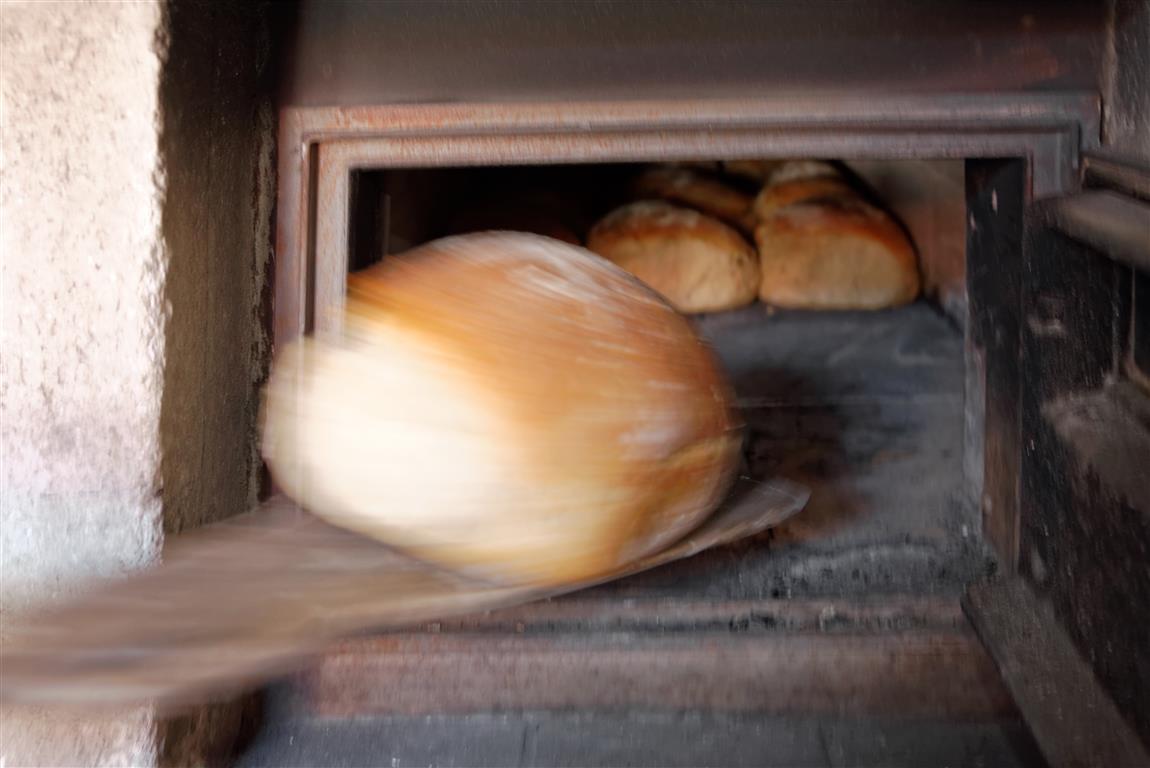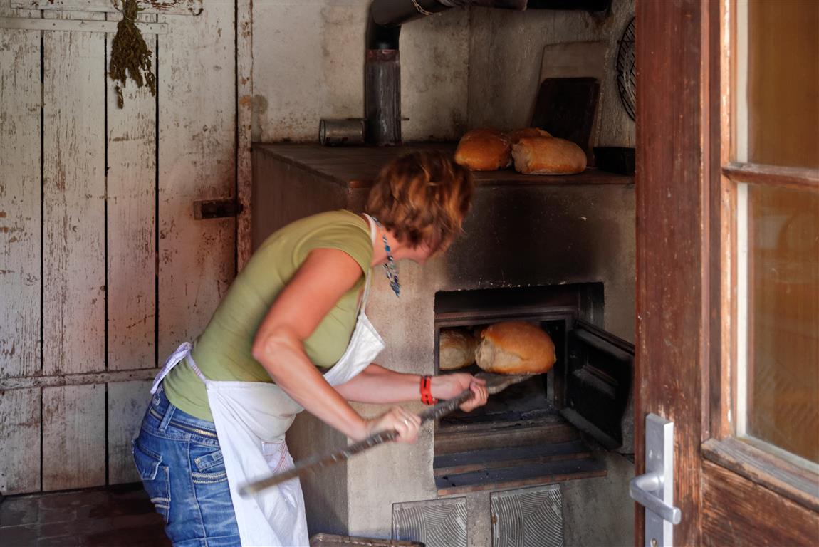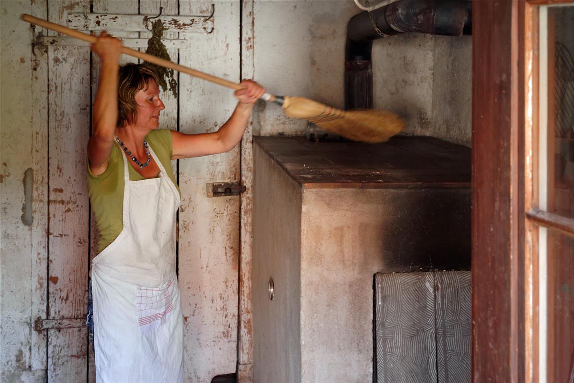 Am folgenden Backtag heizt sie den Ofen früh morgens mit Buchenholz an, die Holzscheide bedecken dabei den mit Schamottstein ausgelegten Ofenboden. Bis diese vollständig heruntergebrannt sind und der Innenraum die richtige Temperatur erreicht hat, können schon mal ein paar Stunden vergehen. Die richtige Backtemperatur fühlt Elke an der Abstrahlwärme des Ofens. Der eingebaute Ofentermometer ist für sie heute überflüssig. Jetzt räumt sie die Glut aus dem Ofen und wischt den Boden sauber, so dass er bereit ist fürs Backen.