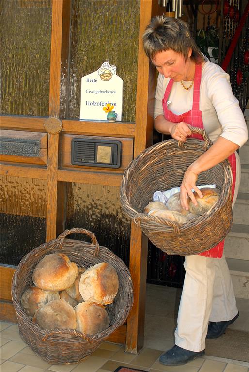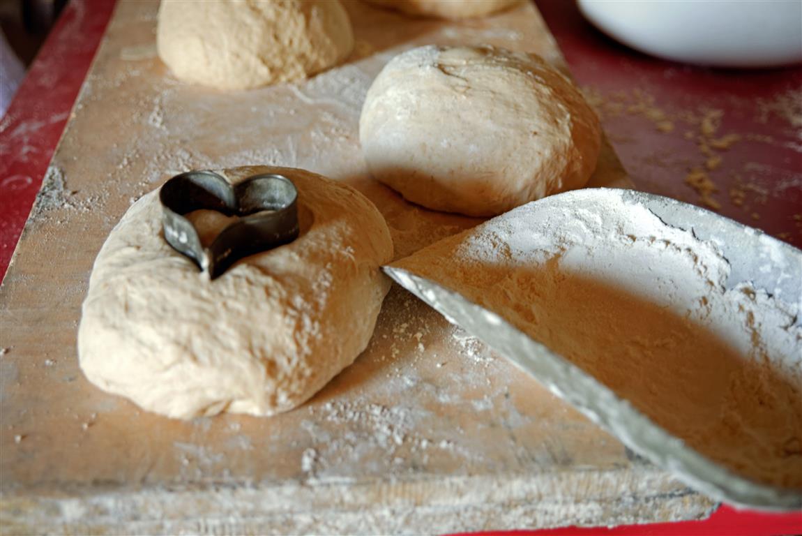 Der Vorteig wird mit den restlichen Zutaten vermengt und geknetet. Anschließend werden 500 g schwere Rohlinge abgeteilt, jeder minutenlang mit Liebe und Geduld geknetet, gefaltet und auf ein bemehltes Brett gesetzt. Ihre Zutaten wiegt Elke schon lange nicht mehr ab, sie hat es im Gefühl: Einige Schaufeln Mehl, die dazu passende Menge Hefe und soviel Salz, wie eben in einer gewölbten Hand Platz hat. Mit der Wassermenge stellt sie die richtige Konsistenz ein. Nach der Gärzeit von bis zu 180 Minuten gibt sie die Rohlinge auf ihre Backschaufel, hinterlässt ihre persönliche Botschaft an ihre Kunden in Form eines Herzabdruckes und schieß so in einem Backgang rund zehn bis zwölf Brote nacheinander in den Ofen.