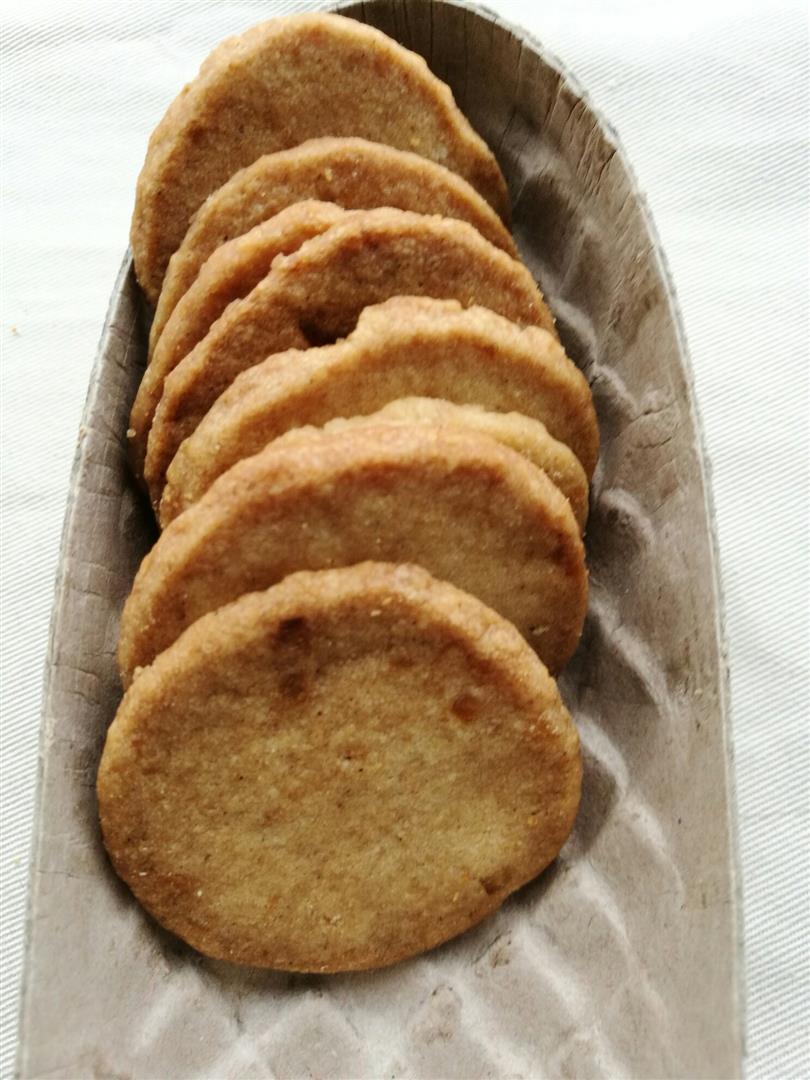 - Die kalten Teigrollen in 0,5 cm dünne Scheiben schneiden, mit genügend Abstand aufs Backpapier legen und auf mittlerer Schiene ca. 20 Minuten backen. Nach dem Herausnehmen erst abkühlen lassen, bevor sie in gut verschließbare Dosen oder Gläser verpackt werden können.