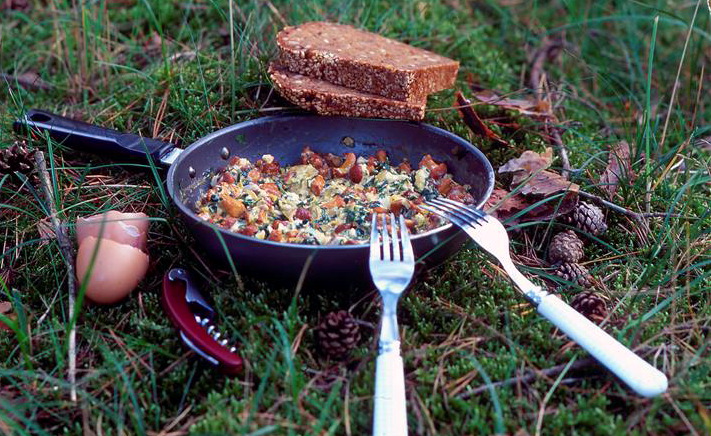 Ich gebe dazu gerne verquirlte Eier mit in die Pfanne und erhalte so zusammen mit Brot eine vollwertige nach Wald duftende Mahlzeit.