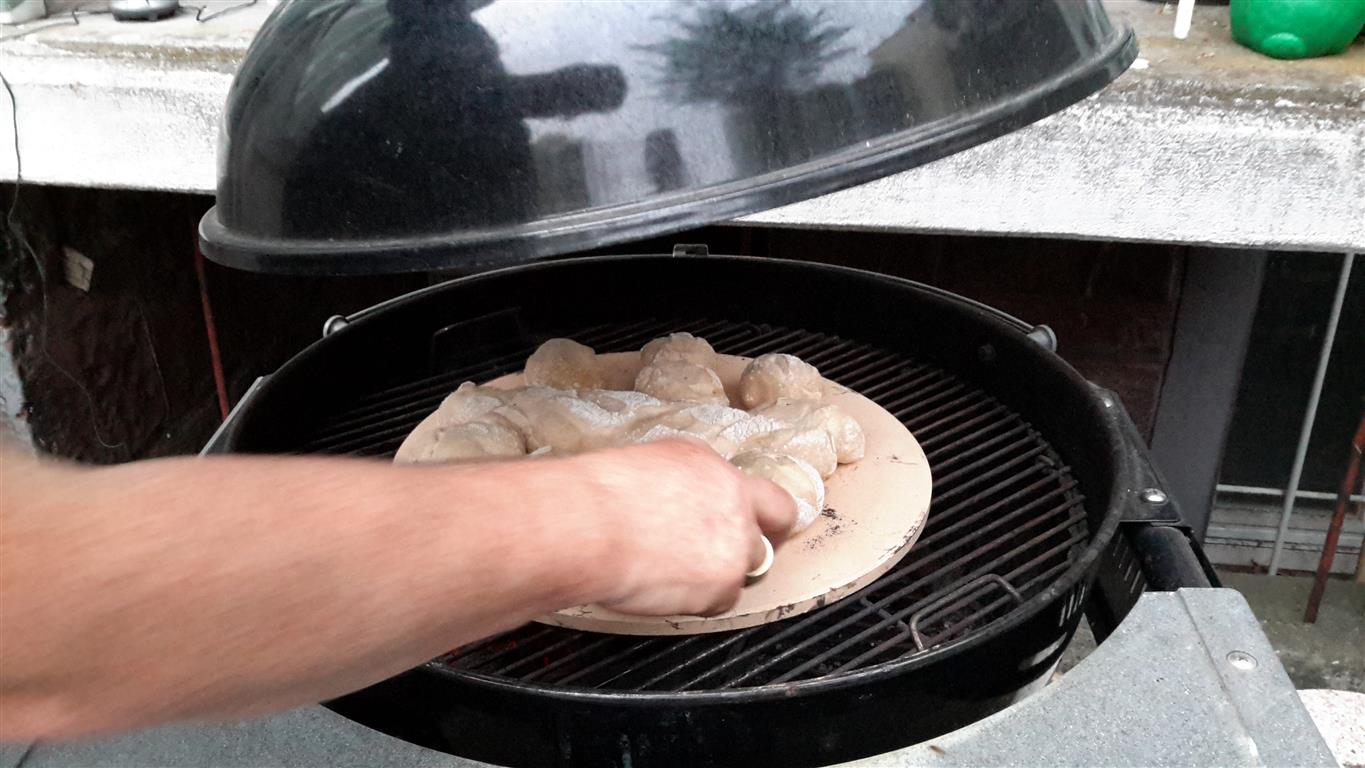⊕ Für kleine Fougasse den gut aufgegangenen Teig vorsichtig auf die Arbeitsfläche heben und spitzwinklige Dreiecke abtrennen. Mit einer schmalen Teigkarte Rippen einstechen, gut auseinanderziehen und im Grill bei 200 Grad für 20 Minuten backen. Bei zu hohen Anfangstemperaturen, so lehrt uns die Erfahrung, eher dünne Fladen ausbacken, die schnell durchgebacken sind und keine große Oberhitze benötigen.