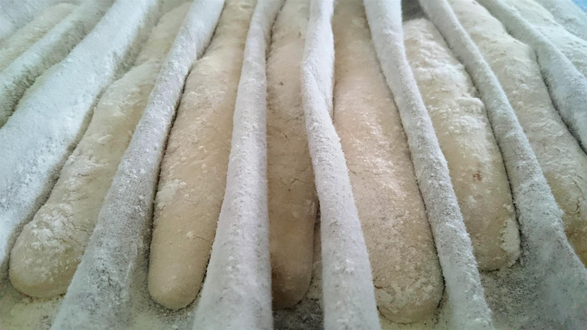 Die restlichen Teigstangen werden zweimal längs eingeschnitten und bei 240°C im vorgeheizten Backofen mit umgedrehtem Backblech für 10 Minuten gebacken und mit fallender Hitze weitere 10 Minuten bei 200°C schön knusprig ausgebacken.
