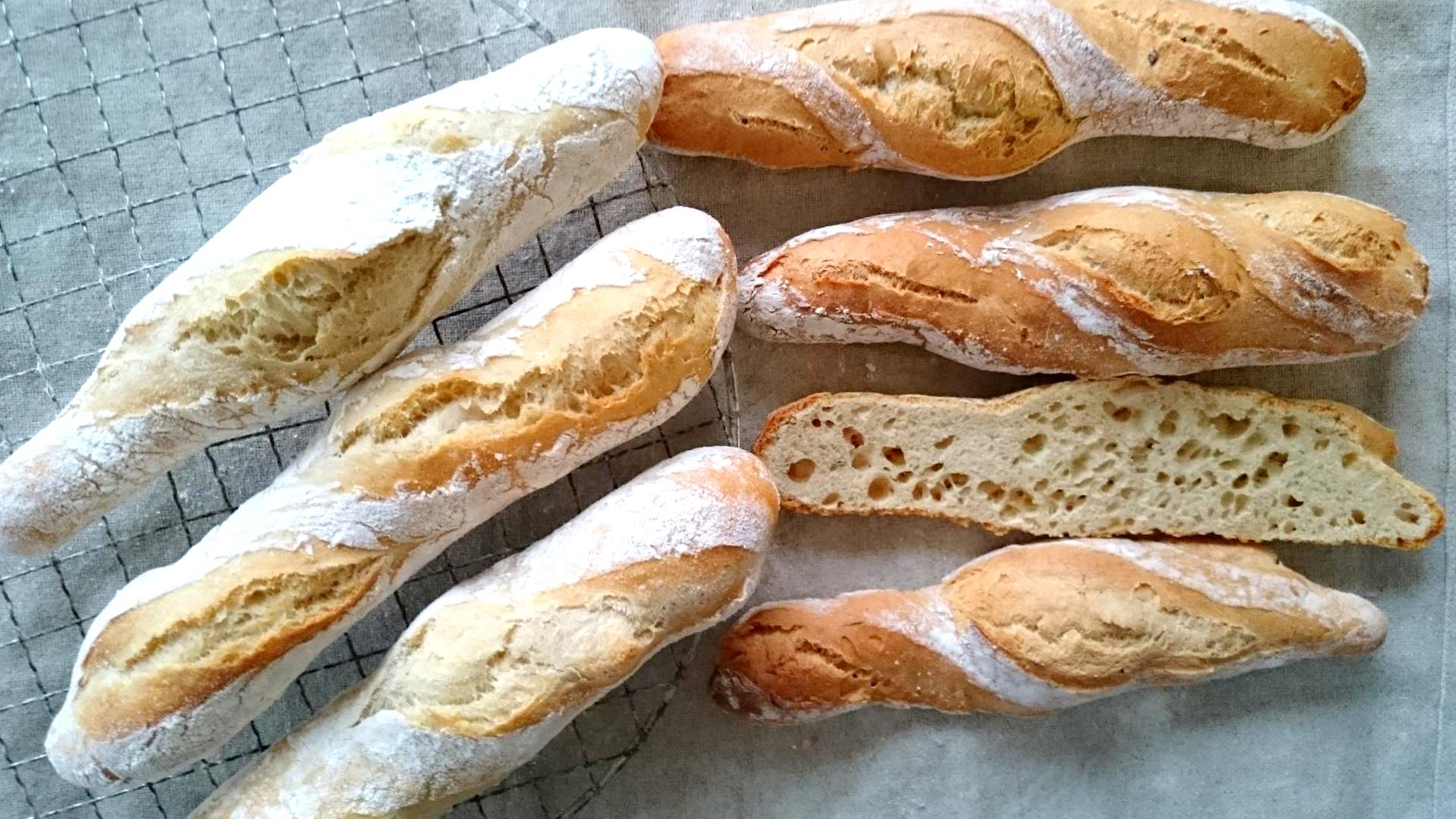 Zur Hälfte gebackene Baguettes zum Einfrieren (links auf dem Rost gelagert) . Vollständig durchgebackene Baguettes (rechts).