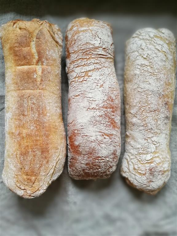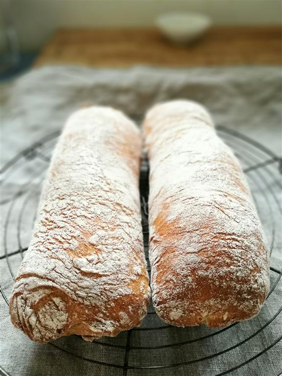 Chiabatta, heißt übersetzt Pantoffel und ist ein flaches, langgezogenes, italienisches Brot. Neben Baguette, Focaccia oder das einfache Fougasse mit Zitronenduft ist dies eines meiner Lieblingsformen für ein schnelles Weißbrot. Normalerweise wird bei Chiabatta ein Teil der Zutaten (ohne Salz) als Biga Vorteig hergestellt und dem Hauptteig zugegeben. Biga ist ein Teig aus 100g Mehl, 100g Wasser und 1g Hefe der nach 12-24 Stunden kühler Lagerung dem Hauptteil zugegeben wird. Dadurch wird der Teig stabiler und deutlich formbarer und dehnbarer ohne gleich die Gase zu verlieren. Mehr zu Vorteigen gibt es in unserem neuen Backbuch Backen mit Urkorn.