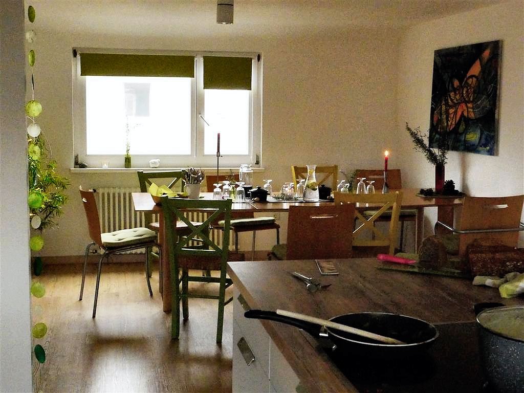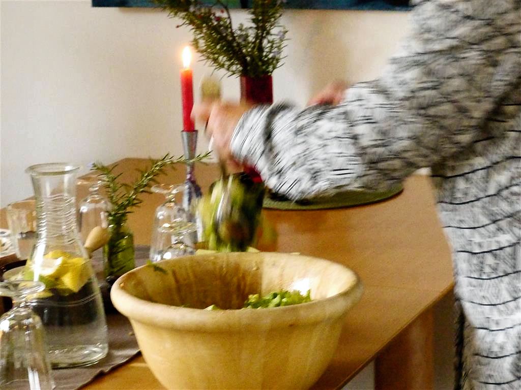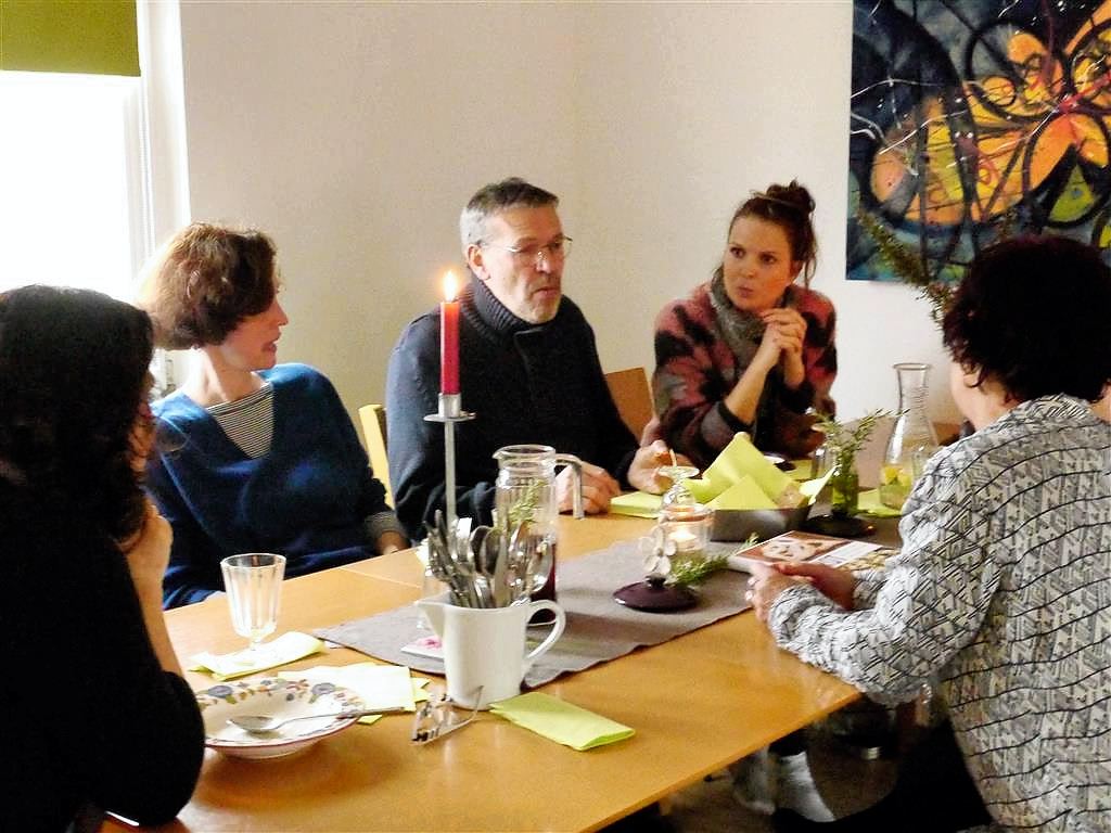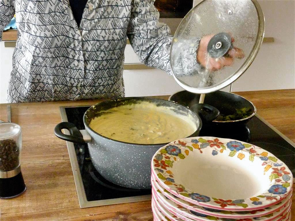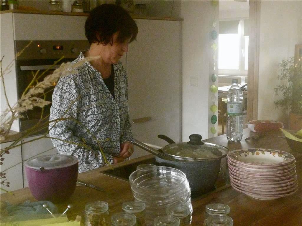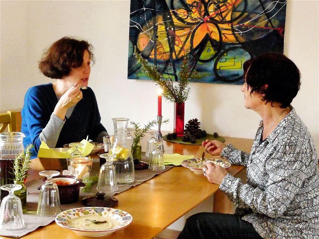 Beim Mittagstisch meiner Freundin Gundi in Neureut ließ ich mich so richtig verwöhnen. Dabei habe ich diese leckere Suppe kennen gelernt. Der Mittag begann mit einem Apero aus selbstgebackenen Broten mit Dips. Danach gab es dieses cremig gerührte Süppchen, dessen Rezept mir Gundi aufgeschrieben hat. Es ging dann bodenständig weiter mit Kartoffel-Lauch Gratin, das mit einem Salat serviert wurde. Abgerundet wurde das vegetarische Menü mit einem super Nachtisch, der im Glas serviert wurde. Hier zunächst einige Eindrücke dieses gemütlichen Mittagessens hauptsächlich mit Freunden und Bekannten.