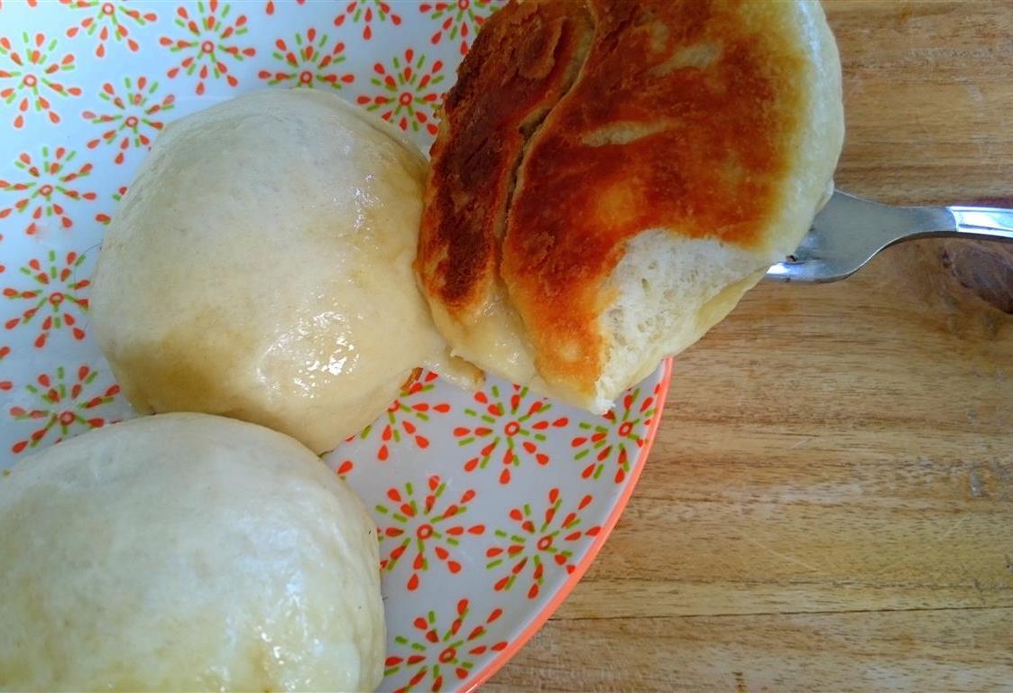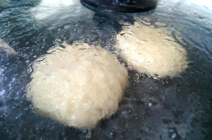 - Nach 10-15 Minuten sollte das Wasser verdampft sein und es kann der Deckel vorsichtig entfernt werden. Wurde ausreichend Fett verwendet, haben die Dampfnudeln nun eine schöne, knusprige Kruste erhalten und sind gut aufgegangen.
