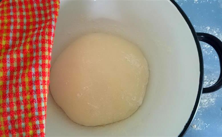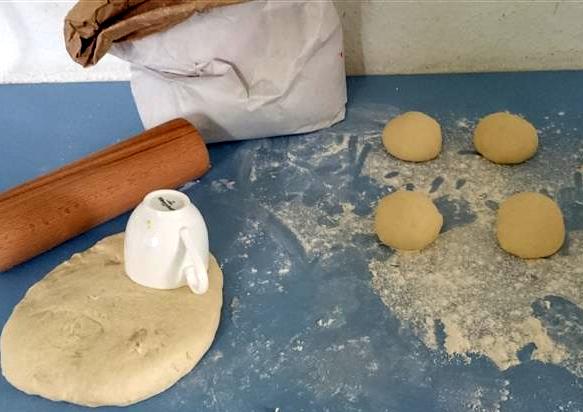 - Nach dem Ruhen den Teig auf die Arbeitsfläche heben, ein paar mal ineinander falten und rundwirken. Danach mit dem Wellholz vorsichtig zu einem 4 cm dicken Fladen rollen. Mit einer Espressotasse kleine Kreise ausstechen und diese auf der bemehlten Arbeitsfläche abgedeckt ca. 30 Minuten lang gut aufgehen lassen.
