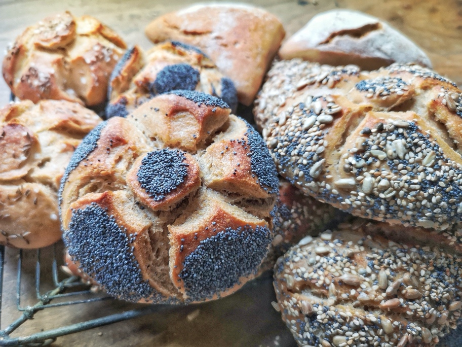 Derselbe Teig nur mit Saaten aussen drauf und nicht als Saatenbrühstück innen drin kann auch zu Brötchen geformt werden. Nach dem portionieren in ~80 g Stücke diese rundwirken, 30 Minuten ruhen lassen, die mehlfreie Oberfläche danach in Wasser tauchen und in einer Staatenmischung wenden, bestehend aus: Sonnenblumekernen, Sesam, Mohn, Hanfsamen und Fenchel.