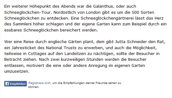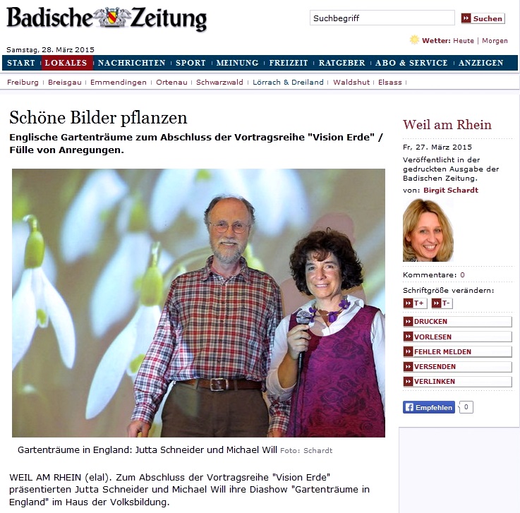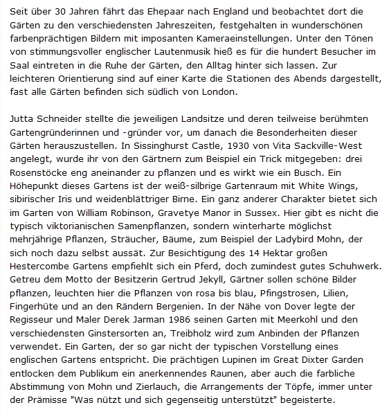 Die Diashow von Hannas Tochter Jutta Schneider und Michael Will über GartenTräume in England am 08. März 2015 im Kino Kandern und am 24. März 2015 in Weil am Rhein im Haus der Volksbildung war ein toller Erfolg! Die Diashow war Teil der Vortragsreihe Vision Erde – Bilder unserer Welt, die sehr erfolgreich von Martin Schulte-Kellinghaus organisiert wird. Themen und Termine sind stets aktuell unter www.visionerde.com zu erfahren. An beiden Tagen kamen insgesamt über 350 Personen zusammen, die sich begeistern von Jutta und Michael musikalisch untermalten Bildern in die Welt der Gärten entführen liesen.