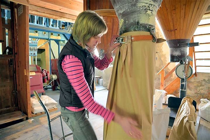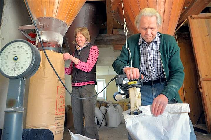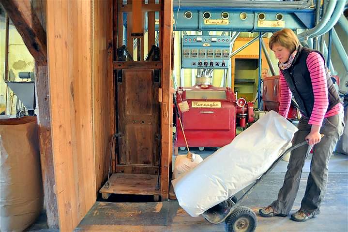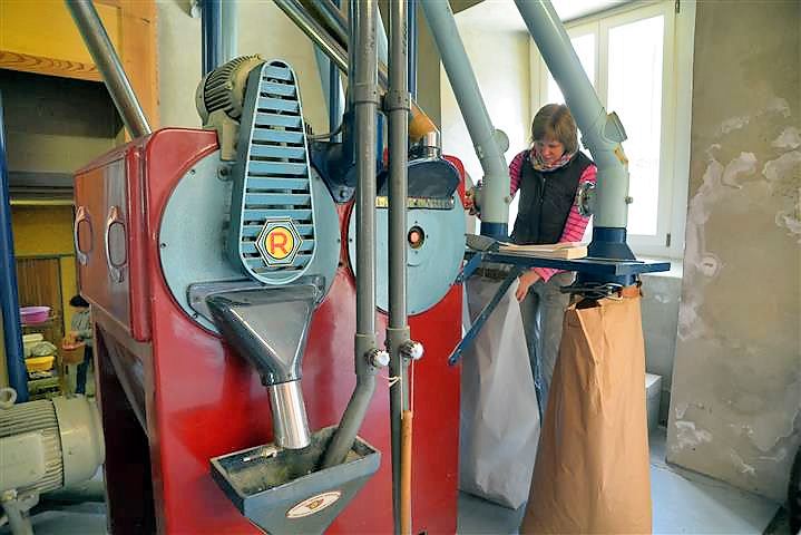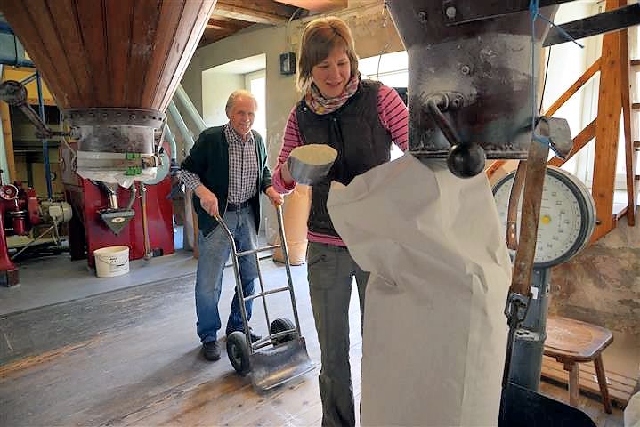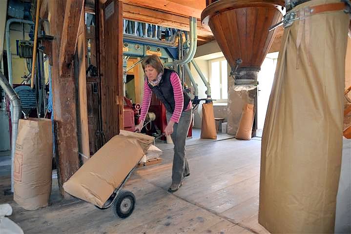 Die Journalistin Birgit Duval hat erst kürzlich einen lebendigen und informativen Bericht über unsere Müllerin veröffentlicht, dem ich nichts mehr hinzufügen kann und den ich hier in Auszügen wiedergeben möchte: „Von außen sieht die Tantenmühle so gar nicht nach Mühle aus. Es ist ein nüchternes Gebäude, das sich markant von den Schwarzwaldhäusern in Malsburg-Marzell abhebt. Innen herrscht ohrenbetäubender Lärm. Es rattert, rumpelt und zischt, als würden die alten Holzbalken jeden Augenblick über einem zusammenstürzen. Mittendrin steht das Herzstück der Tantenmühle: eine Roncaglia Pneumatic Getreidewalzenmaschine. Das italienische Fabrikat erinnert an den Motor eines Dampfschiffes mit aufgesetzten Orgelpfeifen. Mit ihren roten und hellblauen Farben strahlt die Roncaglia modernen Retro-Schick aus, tatsächlich stammt sie aus dem Jahr 1973 und mahlt zuverlässig Getreidekorn zu Mehl, Grieß und Dunst. Zwischen Maschine und Mehlsäcken flitzt Müllermeisterin Roswitha Vollbrecht-Osswald umher und nickt zufrieden. Die Roncaglia läuft wie am Schnürchen, genau wie vor 40 Jahren, als sie ein Mädchen war und in der Mühle ihrem Vater bei der Arbeit zuschaute.