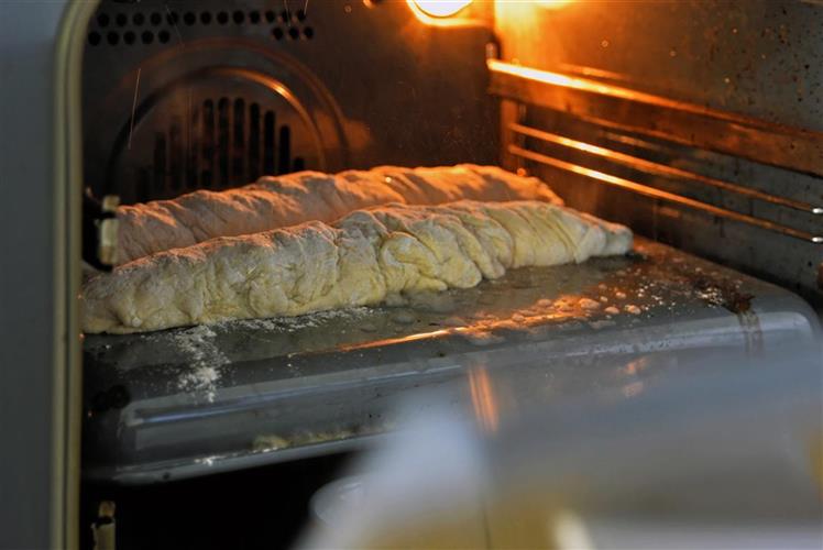 - 10 Minuten lang im heißen Backofen backen, danach die Temperatur auf 200 °C reduzieren und die Baguettes in weiteren 20–25 Minuten fertig backen, dabei die Ofentür in den letzten 5 Minuten leicht öffnen.