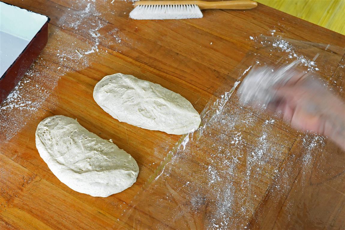 - Die recht weichen Baguetteteigrohlinge auf eine mit Roggenmehl bestäubte Arbeitsplatte setzen und den Rohling ca. 10 Minuten ruhen lassen. Danach mithilfe einer Teigkarte oder den bemehlten Fingerkuppen auspacken und vorsichtig einige Male in sich verdrehen. Auf Backpapier setzen und mit Roggenmehl bestäuben. Abgedeckt nochmals ungefähr 20-30 Minuten lang ruhen lassen. Eine längere Stückgare ist nicht ratsam.