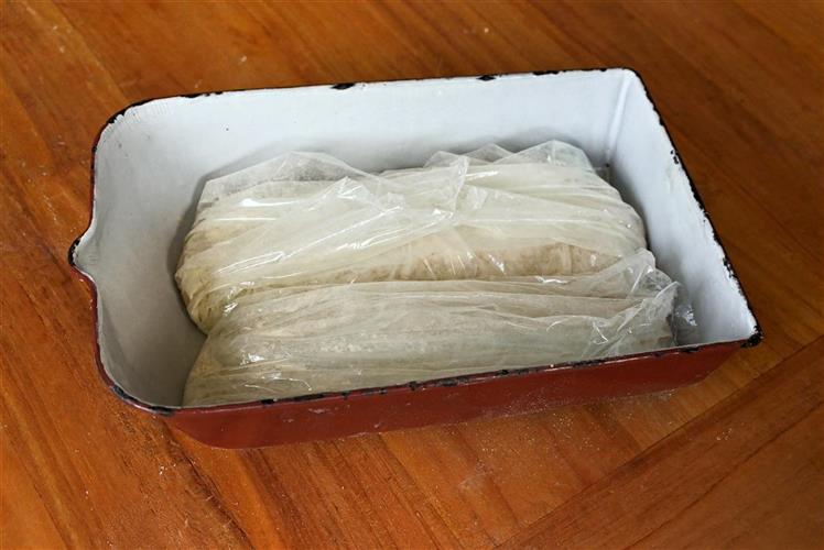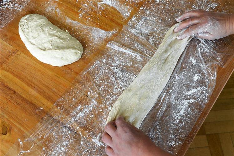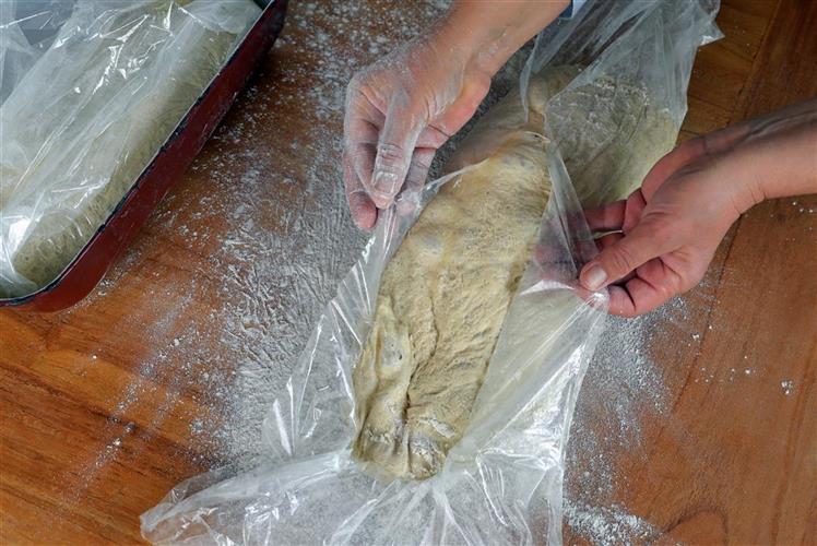 - Wem der Teig zu weich ist, kann die Teigrohlinge großzügig in gut bemehlte Frischhaltefolie einschlagen und mit der Foliennaht nach oben eng nebeneinan der in eine tiefe, längliche Auflaufform setzen. Abgedeckt 1 Stunde lang bei Zimmertemperatur, danach 12 Stunden lang (am besten über Nacht) im Kühlschrank ruhen lassen.