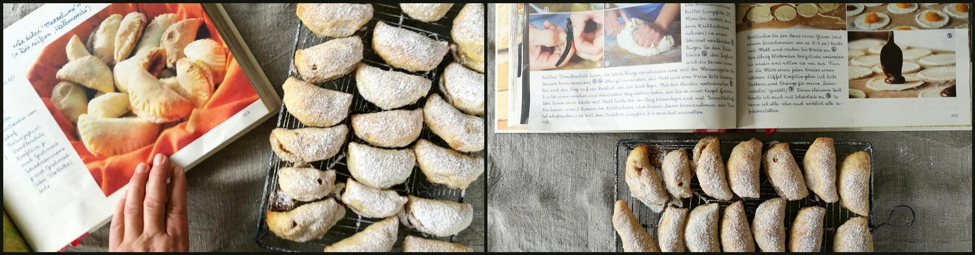 Meine Dolce mezzelune hab ich versehentlich mit Quittengelee gefüllt. Durch den hohen Flüssigkeitsgehalt des Gelees ist die Füllung etwas ausgelaufen. Deshalb besser Marmelade oder Konfitüre verwenden.