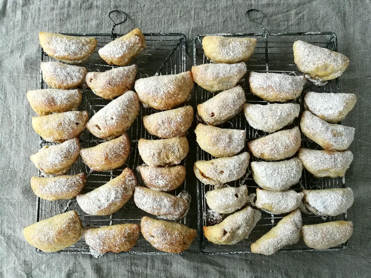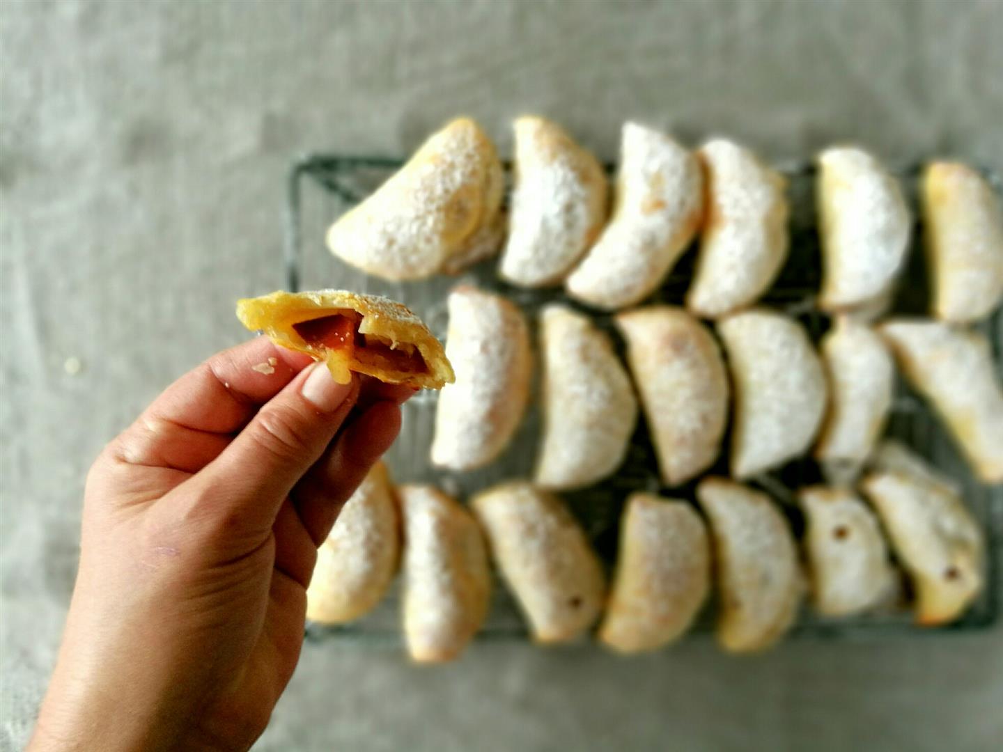 - Gut gekühlter Teig in vier Teile schneiden. Jedes Teil 3-4 mm dünn ausrollen und beliebig große Kreise ausstechen. Teigkreise mit 1 TL Marmelade füllen und zu Halbmonde einklappen. Die Ränder mit den Fingern zusammendrücken und mit den Zinken einer Gabel gut abdichten.