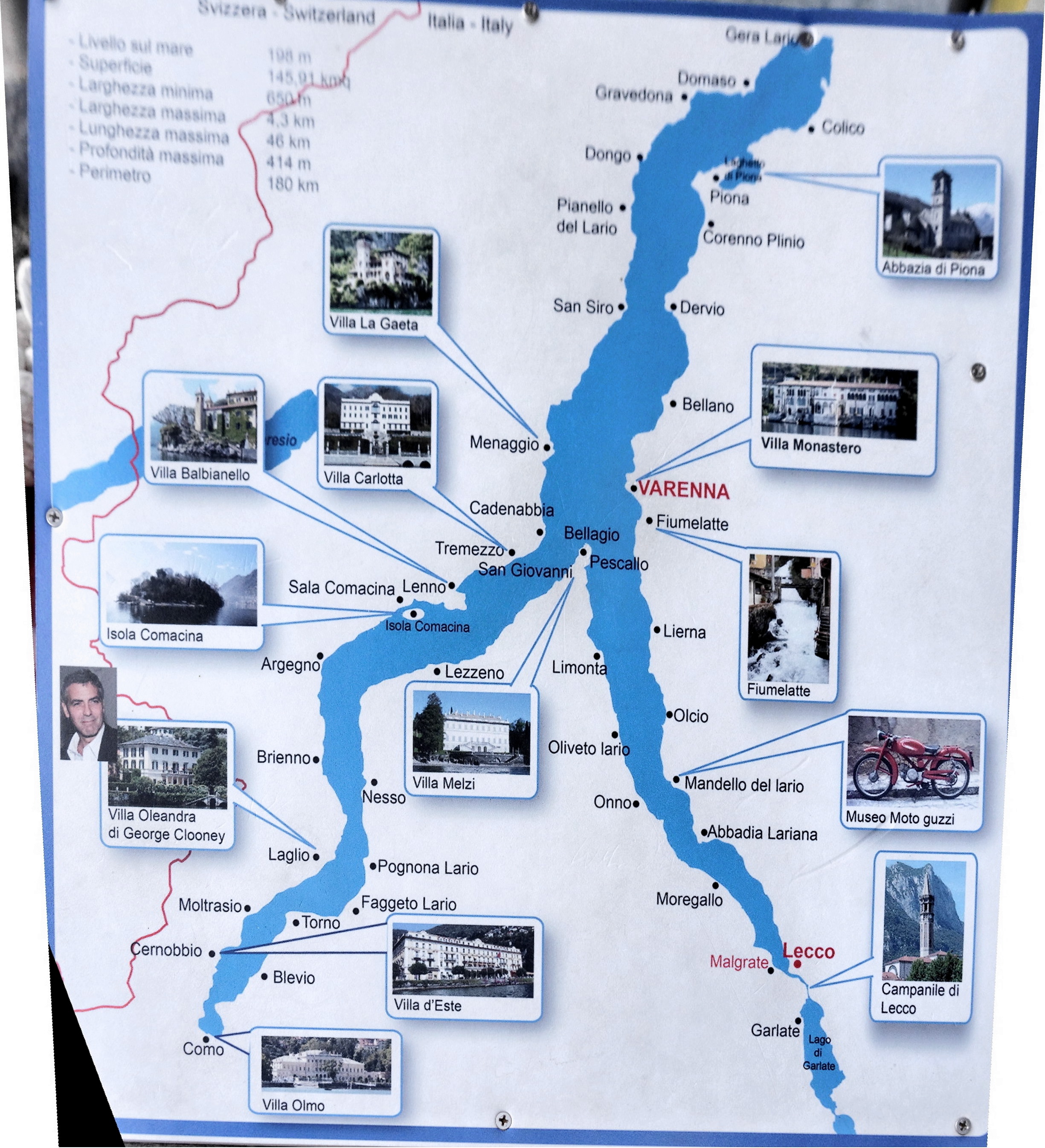 Der Comer See ist alleine schon eine Reise wert. Besonders das Westufer ist voller toller Villen, sehenswerter Gärten und einer interessanten Uferpromenade. Wir gehen auf einen Campingplatz in Lenno, ein kleiner Familienbetrieb mit Restaurant wo der Cappuccino noch 1,50 Euro kostet. Dort ist der See am Schönsten. Übrigens gehört bei Laglio George Clooney die Villa Oleander.