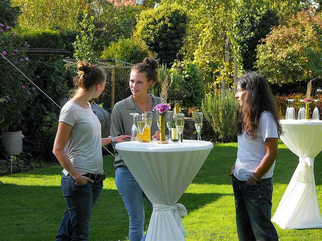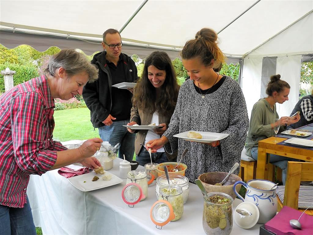 Im wunderschönen Garten unserer Cousine Claudia, in der historischen Gartenstadt Karlsruhe-Rüppurr fand ein familiärer Brotbackkurs statt. Alles passte an diesem herrlichen Septembernachmittag zusammen: Toller Garten, kreative Floristik, heißer Ofen, liebenswürdige Menschen und Hunde, kühle Getränke, köstliche Dips und uriges, duftendes Brot. Unsere Cousine hat für uns ein Open Air Restaurant aufgemacht wie wir es uns schöner nicht wünschen konnten. Das ideale Ambiente für eine Kostprobe aus unserem Buch.