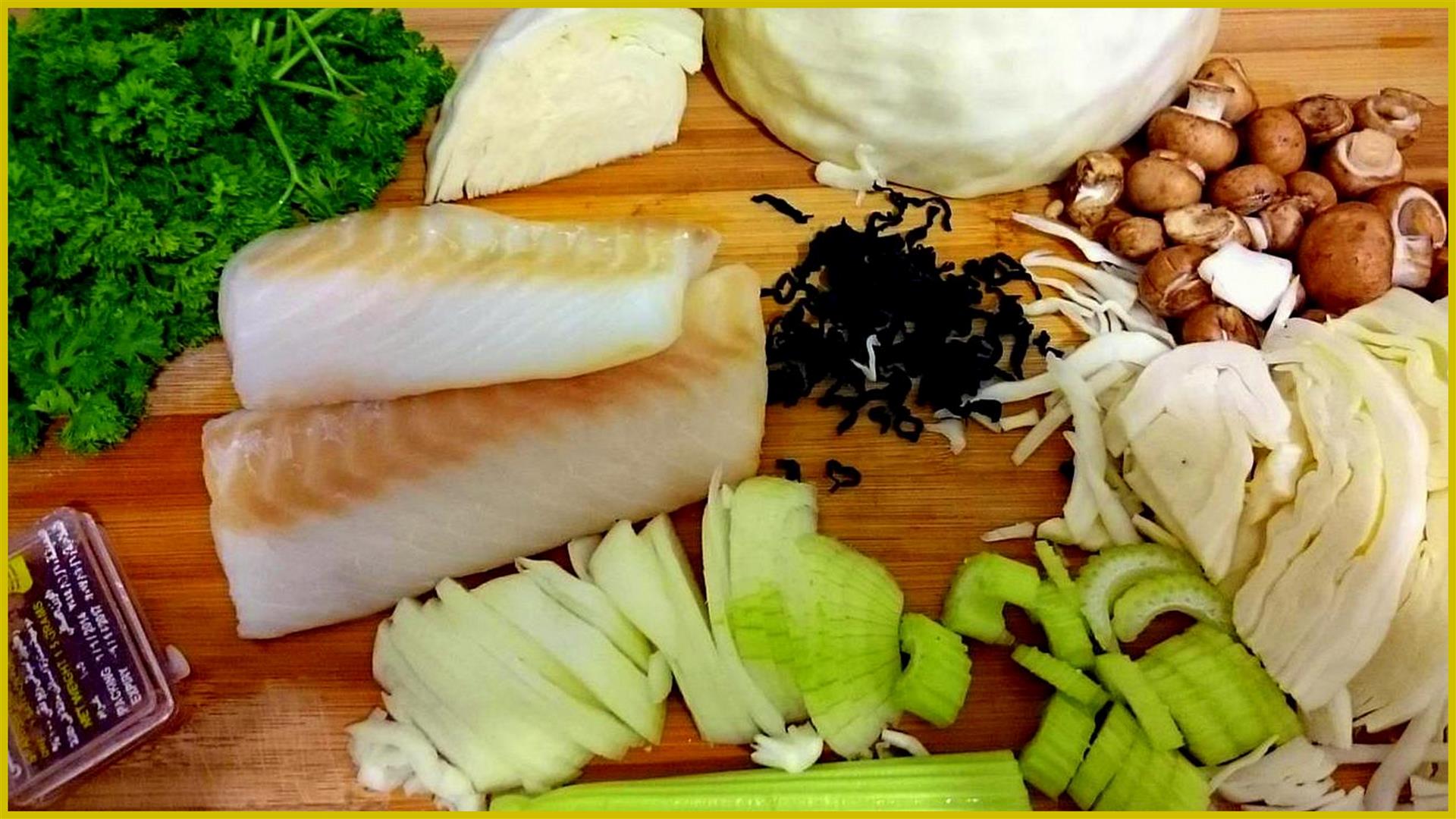 - Gemüse, wie Zwiebeln, Weißkohl, Stangensellerie, Champignons und Petersilie (aber auch Rosenkohl, Brokkoli, Lauch, Erbsen und Fenchel wären denkbar) klein schneiden, hinzufügen und in der Pfanne 2 Minuten lang dünsten. Auch Zitronengras und Lemonscheiben schmecken sehr gut darin.