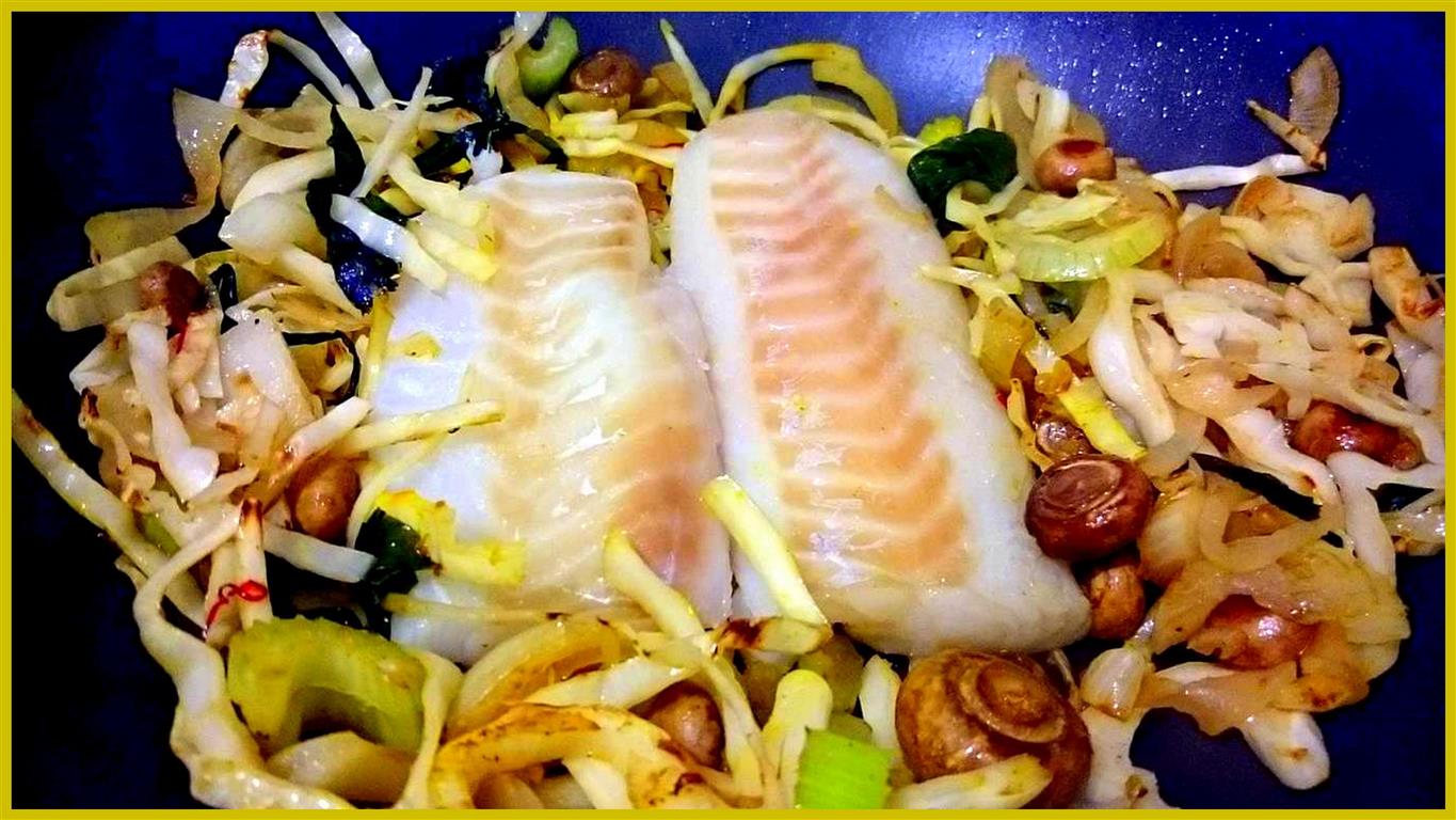 - Nun die Hitze reduzieren und die Fischfilets in die Pfanne legen und kurz für ungefähr 2 Minuten von einer Seite mit andünsten. 3EL Sojasoße und die getrockneten Algen drüber streuen und mit 1l Wasser ablöschen. Wem die Algen zu lang sind kann sie vorher einweichen und klein schneiden.