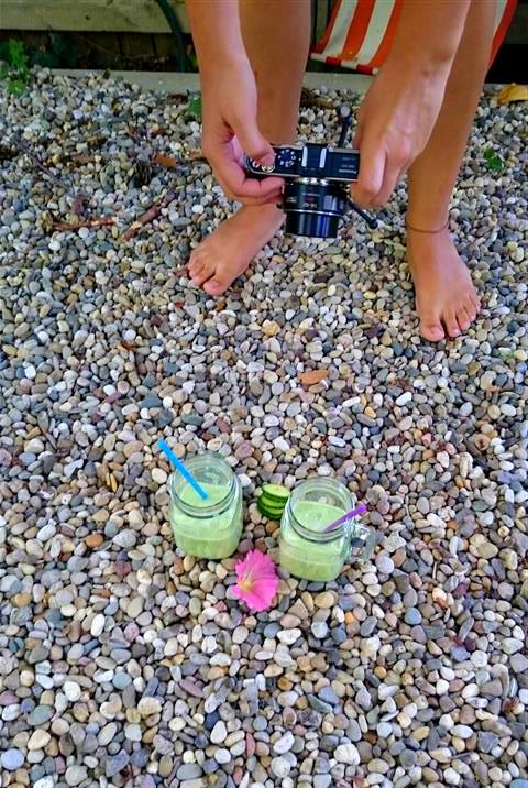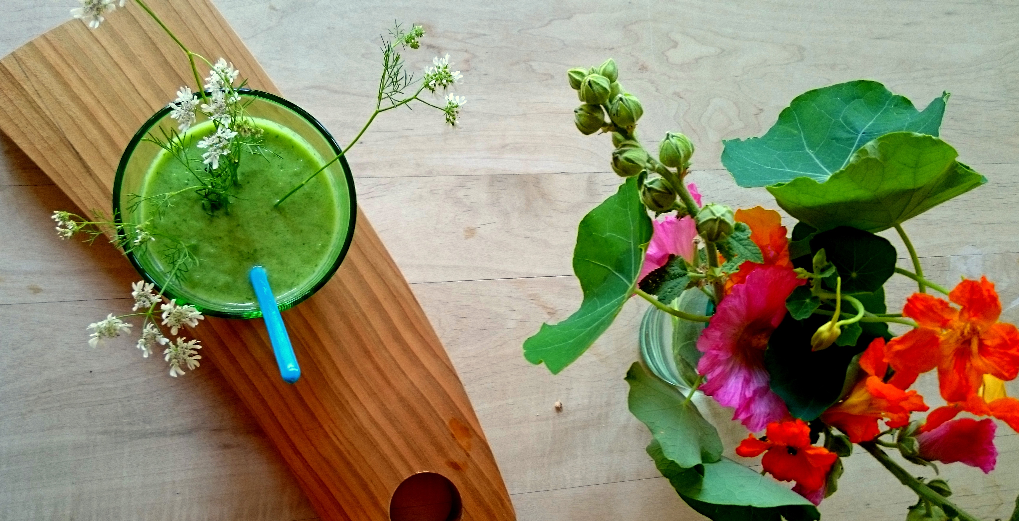 GurkenkaltschaleWir haben für diesen Drink Bio – Gurke inklusive Schale mit fettarmen Joghurt, 1 Prise Chili, Salz, 1 EL Zitronen- und Limettensaft zusammen püriert und mit klein geschnittenem Basilikum und Korianderkraut aus meinem Garten geschmacklich abgerundet. Am Ende kommt in jedes Glas eine Handvoll Eiswürfel und wird mit Korianderblüten schick in Szene gesetzt.  Ich finde auch Blätter der Kapuzinerkresse oder Pfefferminze geschmacklich sehr passend. Auch frischen Dill kann ich mir sehr gut vorstellen. Probiert es einfach selbst aus.