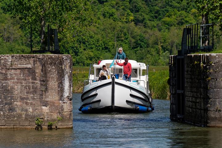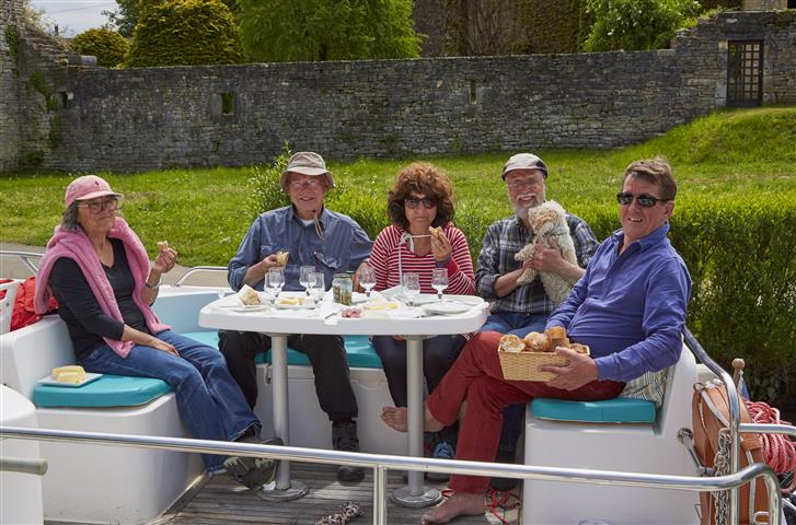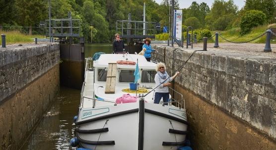 Hier ist wie auch an Land, der Weg das Ziel. Wir starten in dem kleinen beschaulichen Hafen Scey-sur-Saône und tuckern über Ray- und Gray- nach Pontailler-sur-Saône und wieder zurück. Das sind unsere geografischen Reisefixpunkte. Eine ganz wichtige Rolle spielt die Verpflegung an Bord. Jeder kocht einmal sein Lieblingsgericht für alle am Abend. Morgens wird ausgiebig gefrühstückt, um alle Schleusen zu packen, dann gibt es am Nachmittag an einem schönen Anlegepunkt einen Snack, damit wir bis zum Abendessen durchhalten. Ansonsten schauen wir, reden miteinander, meditieren und relaxen während uns der Steuermann oder die Steuerfrau durch die überwiegend grüne Landschaft kutschiert. Einzig die Schleusen sorgen ein wenig für Aufregung und erfordern Teamarbeit. Ja und Tom, er fühlt sich pudelwohl und hat seine Jungfernfahrt mit Bravour bestanden, eben ganz der französische Wasserhund. Hier unsere Reiseimpressionen…