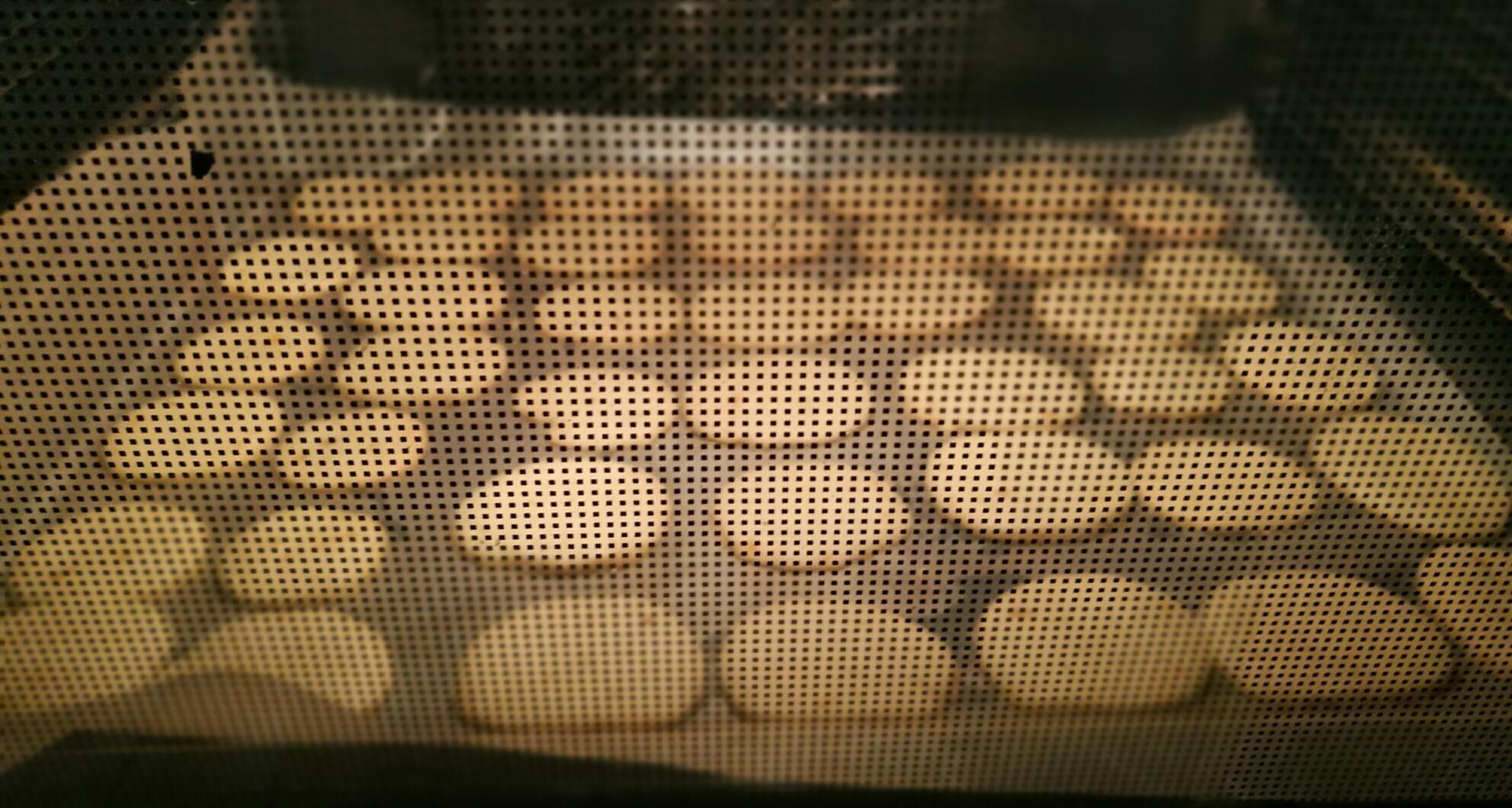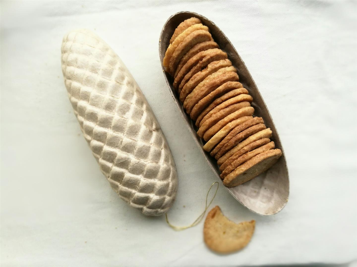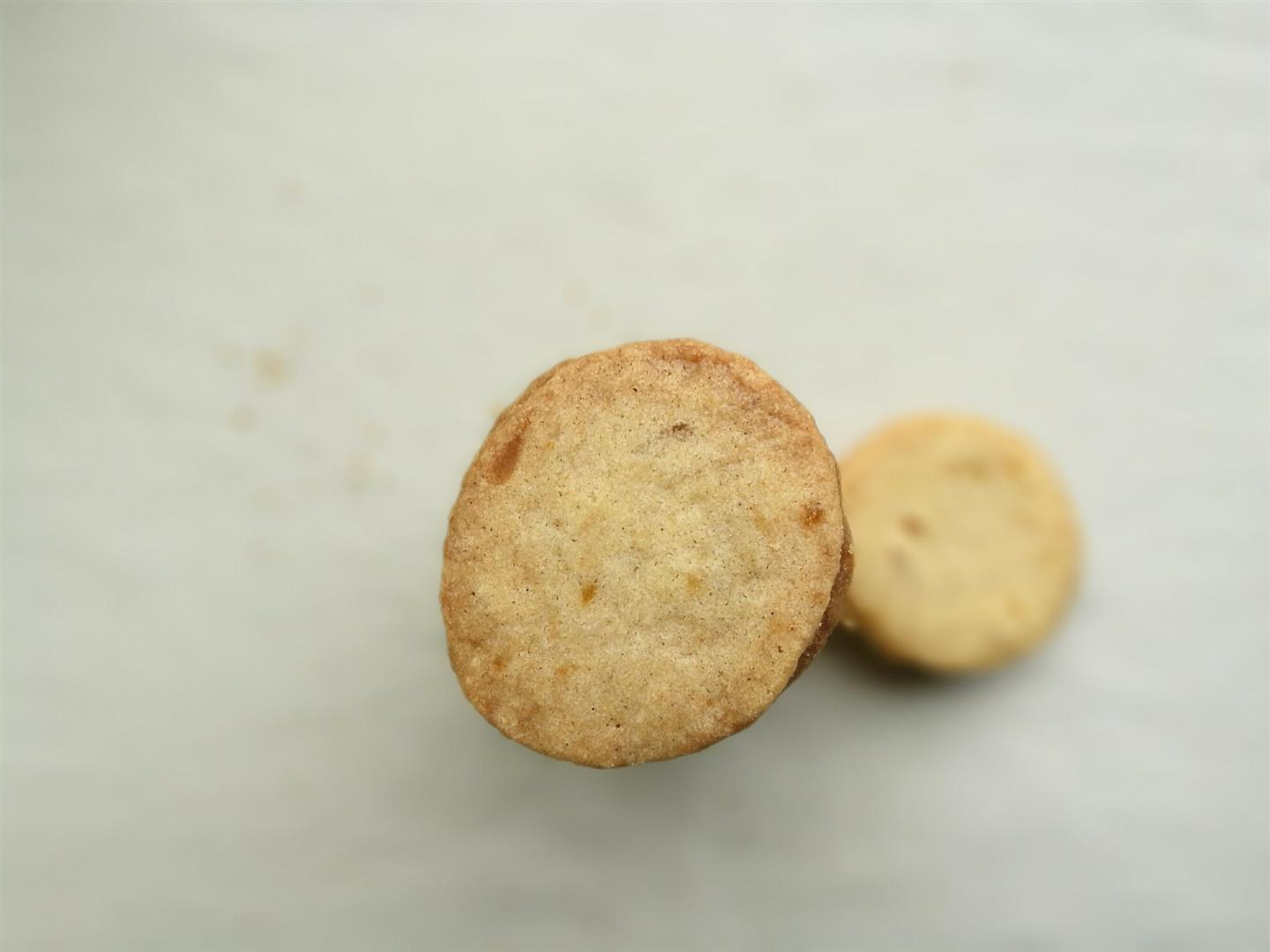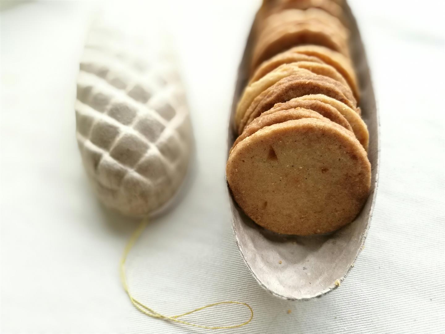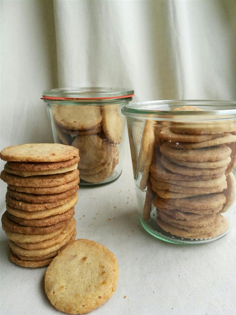 - Die kalten Teigrollen in 0,5 cm dünne Scheiben schneiden, mit genügend Abstand aufs Backpapier legen und auf mittlerer Schiene ca. 20 Minuten backen. Nach dem Herausnehmen erst abkühlen lassen, bevor sie in gut verschließbare Dosen oder Gläser verpackt werden können.