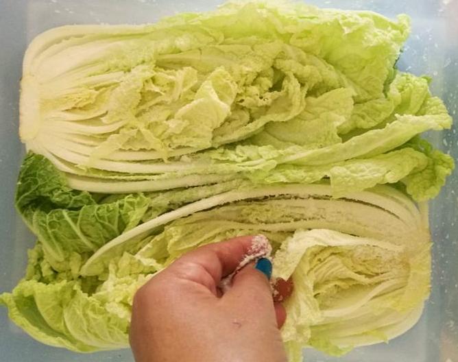 - Die Köpfe anschließend herausnehmen und in eine weitere Schüssel legen und zwischen jedes Kohlblatt Salz streuen. Am Ende mit der vorherigen Salzlake übergießen und testen, ob das Wasser gut salzig ist. Sobald das Gemüse in Salzlake eingeweicht ist, tritt das Salz durch osmotische Vorgänge in die Zellen ein und entwässert so das Gemüse. Dabei wird das Wasser durch Salz ersetzt und es befindet sich dann sowohl in der Lake als auch im Gemüse selbst.