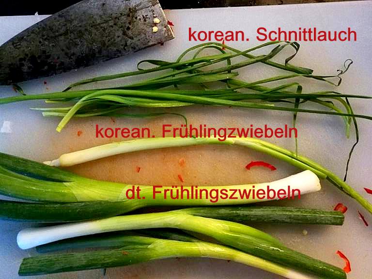 - Weißen Rettich in feine Streifen oder Stifte schneiden, Frühlingszwiebeln und wenn vorhanden korean. Frühlingszwiebeln und korean. Schnittlauch in 4 cm lange Stücke schneiden. Das frische Gemüse unter die Paste rühren und 10 Minuten lang ziehen lassen.
