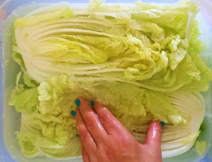 - 10 g Salz in 1L Wasser lösen. 3 nicht all zu große Chinakohl von den äußeren Blättern befreien, jeden inklusive Strung halbieren und in einer großen Glasschüssel mit der Salzlake übergießen und 10-20 Minuten liegen lassen.