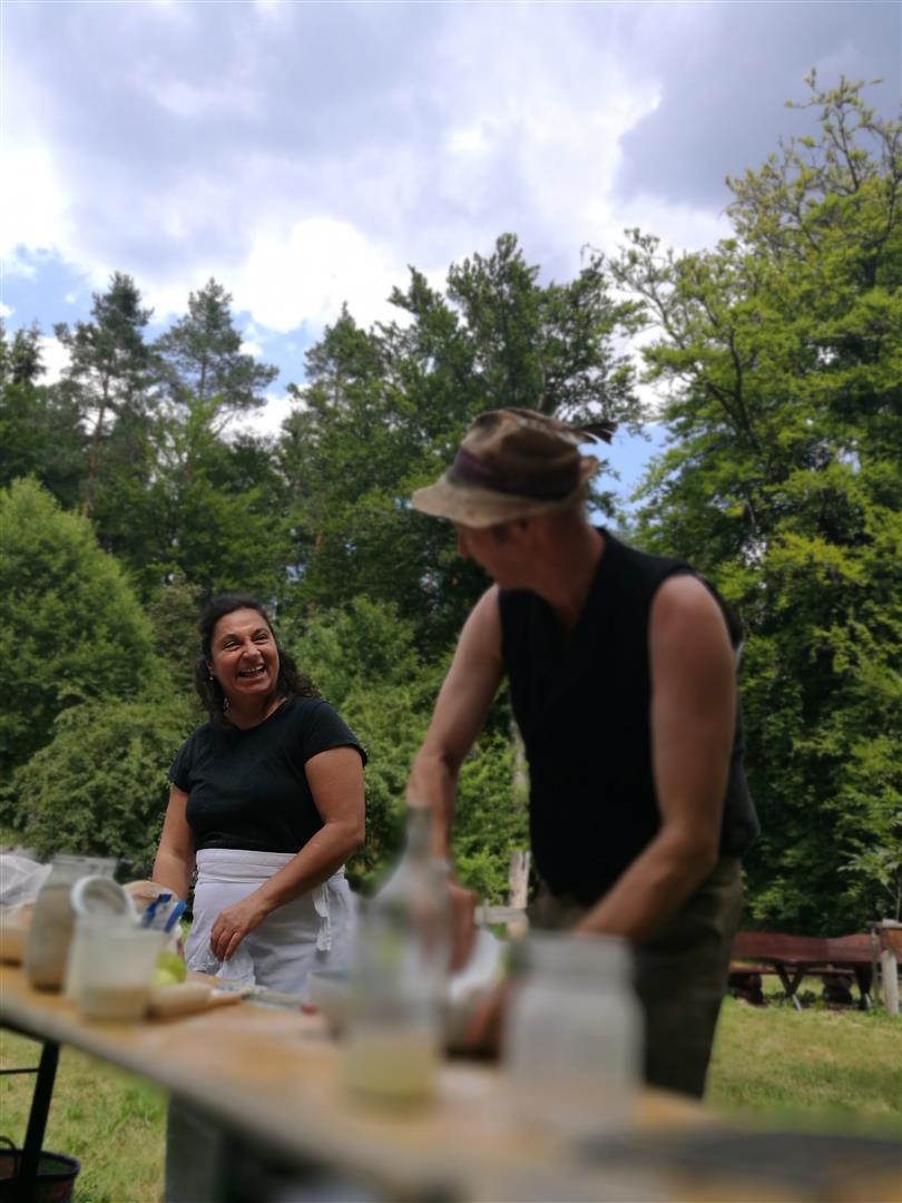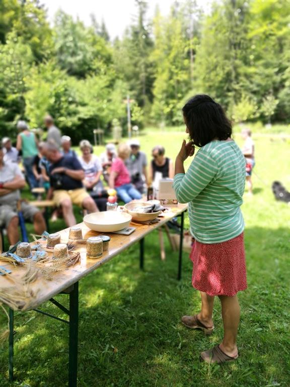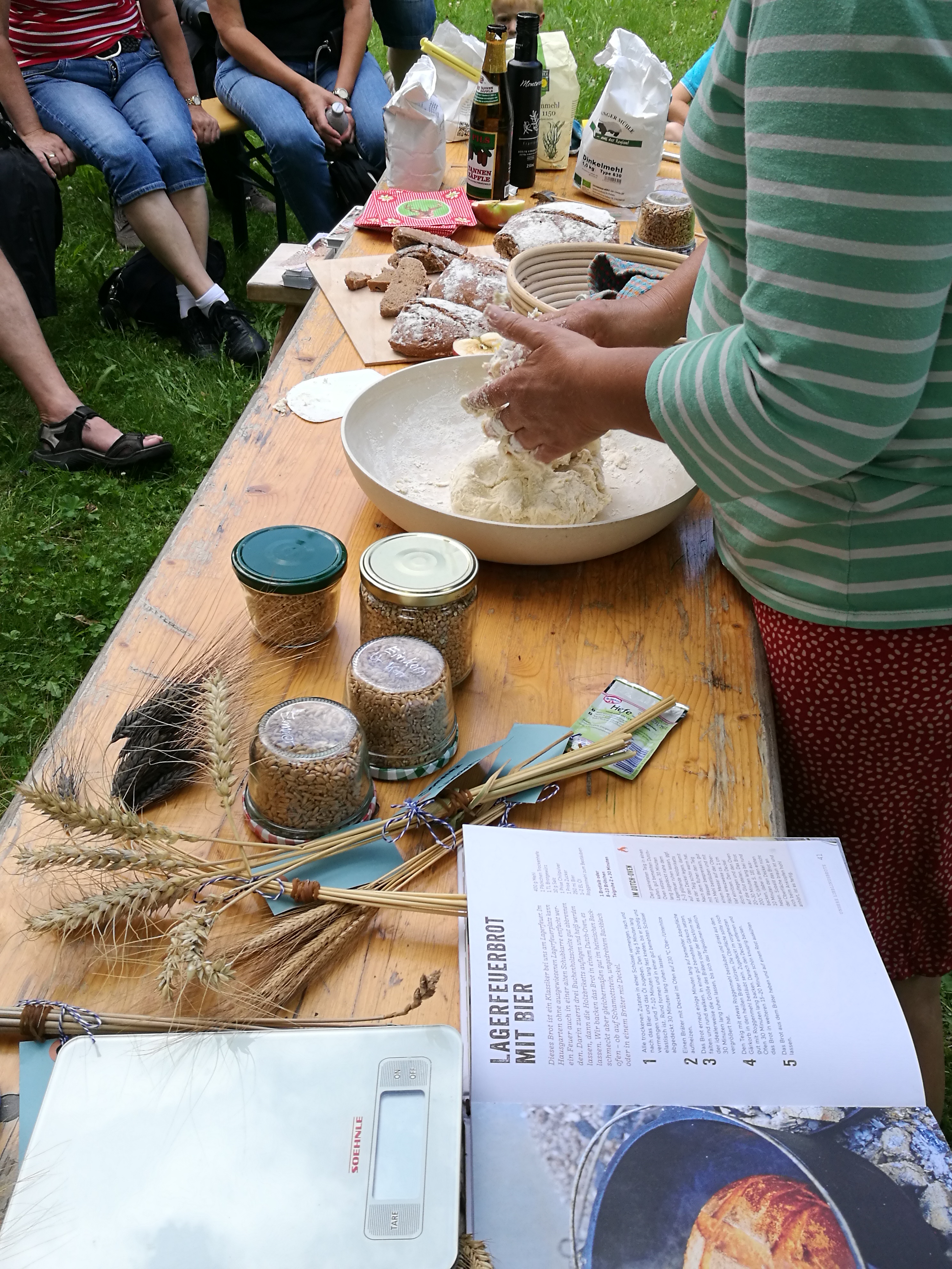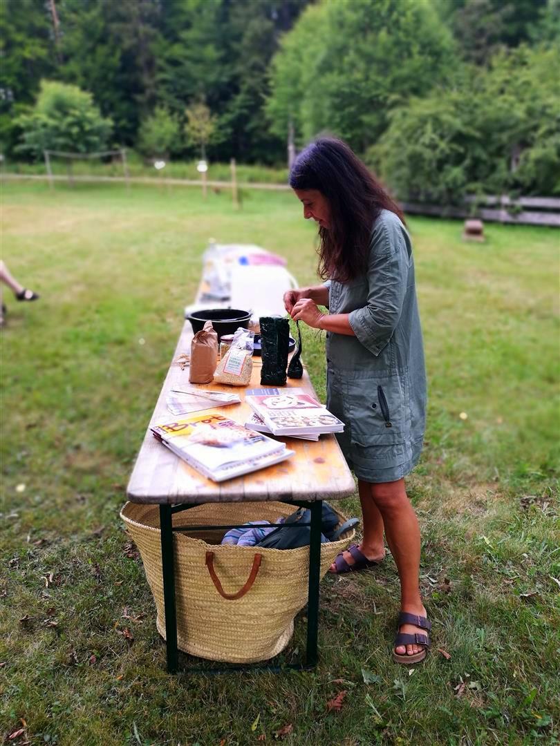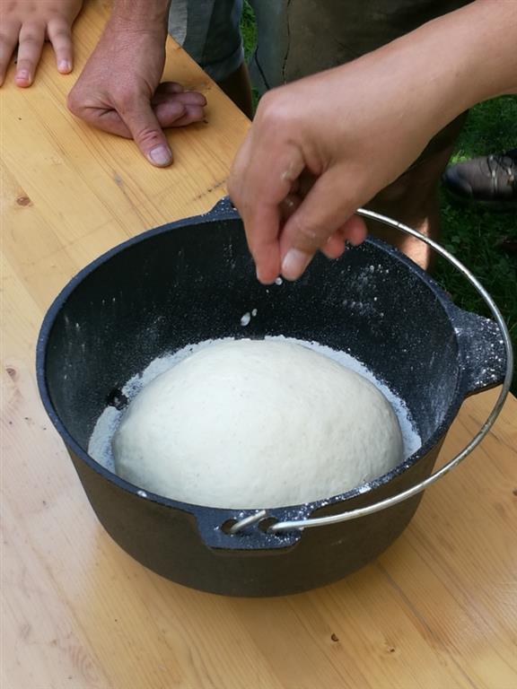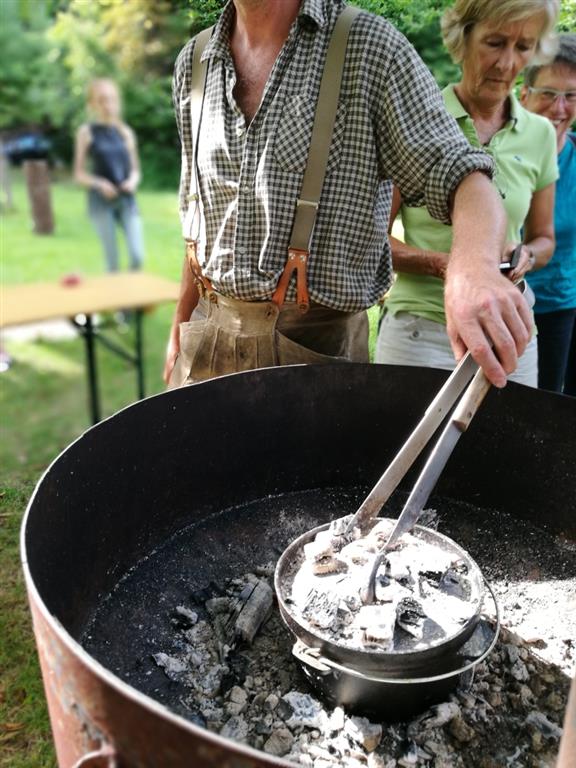 2017 war der Backkurs im Rahmen der Kohlenmailer Kulturwoche meine erste Veranstaltung in schönem Ambiente mit vielen netten Begegnungen und interessanten Gesprächen. Die Teilnehmer beobachteten, wie einfach es ist wenige Brotzutaten durch Dehnen und Falten zu einem geschmeidigen Teig zu verbinden. Mithilfe des gusseisernen Topfes wandelte sich der Dinketeigling innerhalb von nur 90 Minuten zu einem tollen Lagerfeuerbrot.