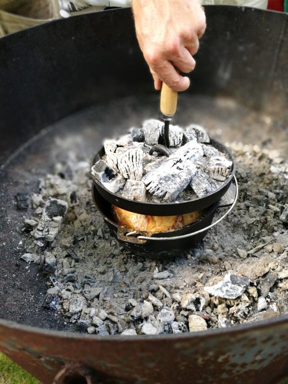 Dieses Jahr haben wir ein wenig experimentiert und zwei Dutch Oven übereinander gestapelt. Theoretisch hätte es klappen können, wir ware jedoch dieses Jahr zu mutig und das Feuer war nicht mit der Stückgare des Teiges im Einklang. Unsere beiden Brote sind dadurch im Oven nicht gut aufgegangen und die Oberhitze war zu wenig. Aber dennoch es war eine tolle Veranstaltung mit einem sehr aufmerksamen und fachkompetenten Publikum. Mir und tina aber uch Thomas un Isolde at es großen Spaß gemacht. Vielen Dank an Alle für’s Kommen.