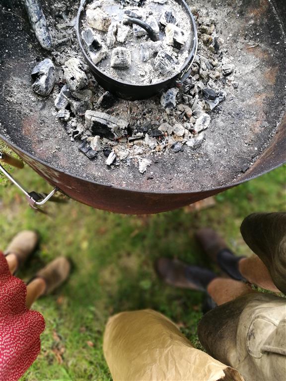 Brot im Topf ist im heimischen Backofen sehr gut durchführbar, aber auf offenem Feuer ist es immer ein „wildes“ Backen, auch für uns. Mitgebrachte Sauerteigbrote mit verschiedensten Körnermischungen/Hanfsamen/Käsefüllung mit selbst gemachter Kräuterbutter haben uns getröstet nd standen frisch gebacken zur Verköstigung bereit.
