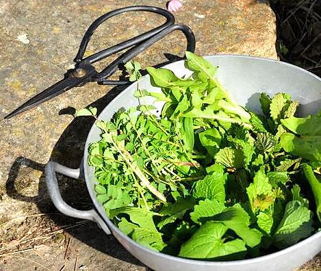 Wir begannen mit einem grünen Salat angereichert mit Wildkräutern, die ums Haus bei mir wachsen. Die Wildkräuter wurden mit warmem Wasser gewaschen und mit einer Zitronen-Olivenöl Vinaigrette serviert. Schabziger Klee darf als Gewürz neben Pfeffer und Salz nicht fehlen. Ich habe hauptsächlich frische Blätter von Knoblauchsrauke, Löwenzahn, Schafgarbe, Bärlauch und Spitzwegerich gesammelt. Schön hätten darauf auch Gänseblümchenblüten ausgesehen, wie ein Gast bemerkte.