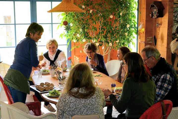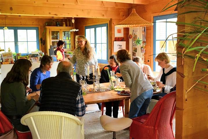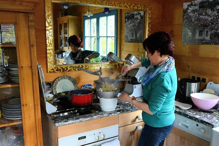 Einige Eindrücke vom Mittagstisch die zeigen, dass zusammen Kochen und Essen Spaß macht. Glücklicherweise hatte ich Hilfe aus Karlsruhe von meiner gutelaune Freundin Gundi und auch von meinem Mann Michael, der hauptsächlich das Aufräumen und den Kaffee übernahm. Gundi ließ es sich nicht nehmen die Spätzle zuzubereiten und brachte dafür eigens ihre „Spatzenpresse“ mit. Überhaupt war sie die gute Fee in der Küche. Von wegen viele Köche verderben den Brei. Zusammen Kochen ist genauso spaßig wie zusammen Essen. Probiert es mal aus.