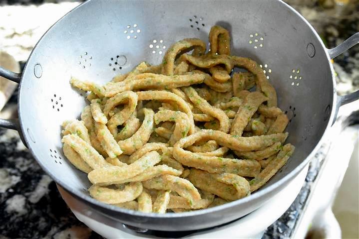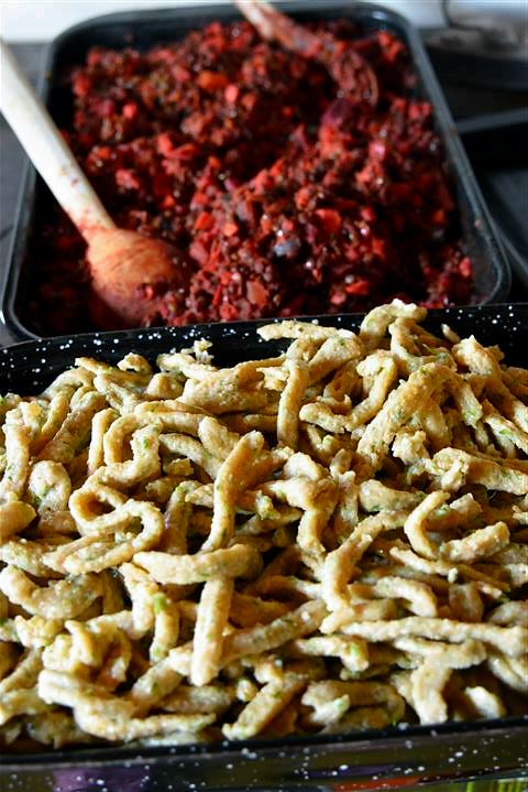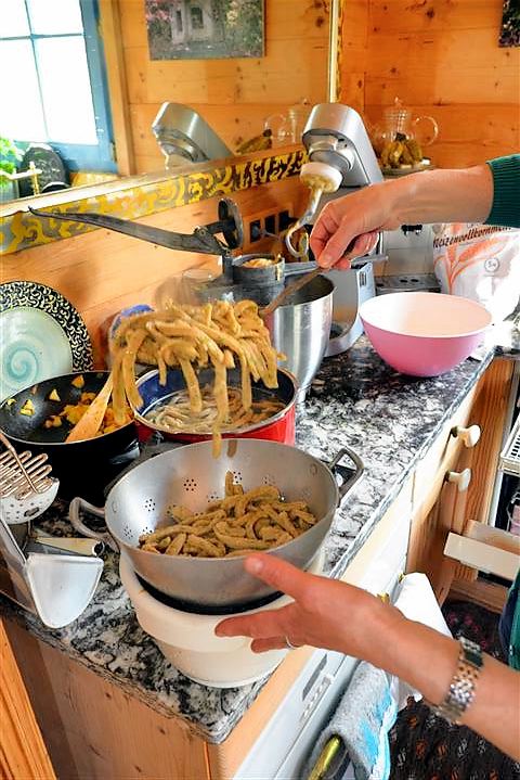 Gundi bestand darauf, dass die Dinkelvollkornspätzle richtig bissfest sind. Wir haben daher den Teig aus 750g Dinkelvollkornmehl und 250g Dinkelgries gemacht. Dazu kamen 10 Eier von Rosis freilaufenden Hühnern und ungefähr 1/4l Wasser. Gewürzt wurde mit Muskatnuss und Salz und einem Bund Petersilie, die fein in den Teig geschnitten wurde. Der Teig wurde 5 min geknetet und ruhte dann ungefähr 2 Stunden. Das waren noch Tipps meiner Schwester Petra.