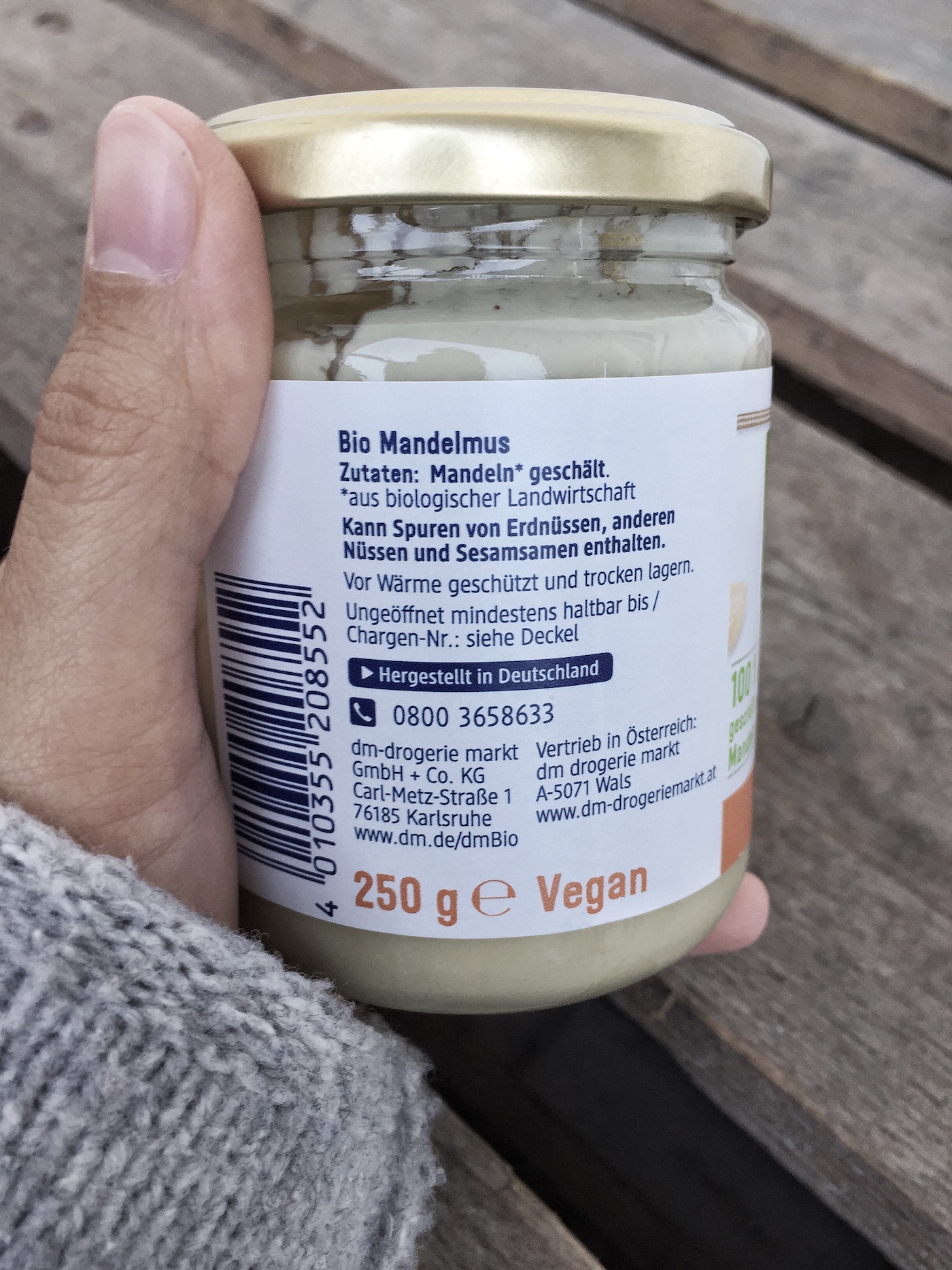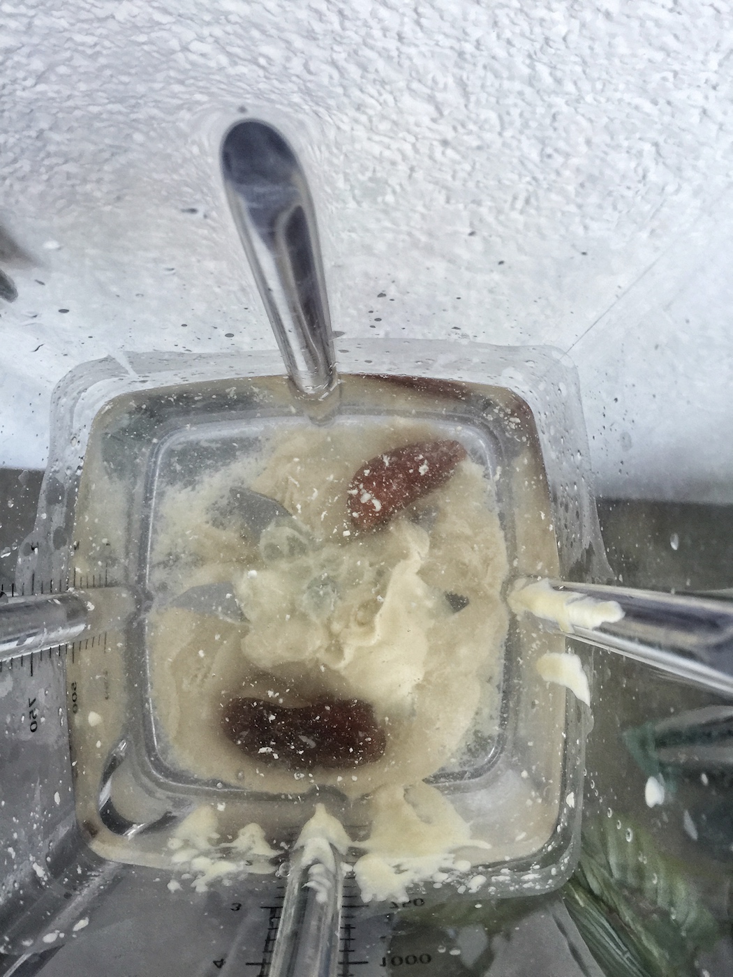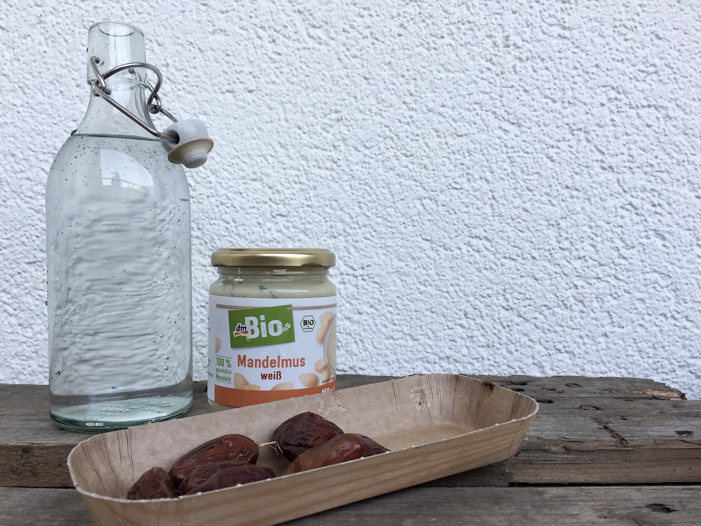 - Als Basis dient mir ein Bio-Mandelmus (oft das von Alnatura oder dm. Ob weiß (geschält) oder braun (mit Schale) ist geschmacklich egal. Alternativ geht auch ganze Mandeln mit leistungsstarkem Mixer pürieren). Als Süßungsmittel gebe ich gerne Datteln hinzu. Das Ganze nun mit Wasser auffüllen, so viel wie in eine 1 L Flasche passt.