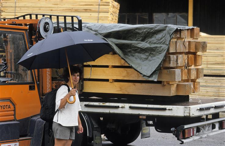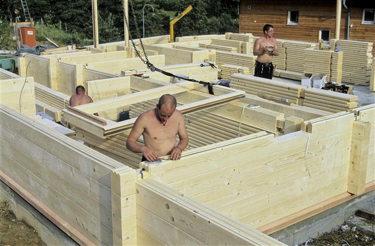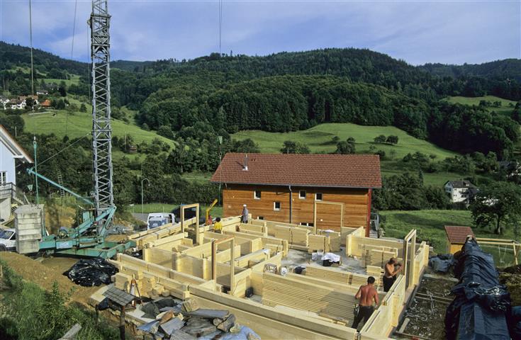 Wie schon gesagt, es sollte ein kleines Holzblockhaus sein. Eine urgemütliche Holzhütte wie wir sie auf der Alm in der Steiermark bei unseren Urlauben kennengelernt hatten. Die alten ehrwürdigen Fichten kamen aus einem natürlichen Aufwuchs bei St. Blasien auf 1000m Höhe. Sie waren um die hundert bis hundertfünfzig Jahre alt und sollten bei uns weiterleben. Nach langen Gesprächen entschieden wir uns für mondgeschlagenes Holz. Auch wenn es noch keine wissenschaftlichen Beweise dafür gibt. Wir sind selbst Wissenschaftler genug, um zu wissen, frei nach Sokrates, dass wir eigentlich nichts wissen. Nach Unterhaltungen mit älteren Dorfbewohnern erfuhren wir dass “ Luna “ Holz am beständigsten ist und traditionsgemäss hier schon immer verwendet wurde. Es wird im Winter bei abnehmendem Mond geschlagen, wenn die Säfte aus dem Baum gezogen sind. Einige meiner zukünftigen einheimischen Nachbarn hatten alle genug Beispiele zur Hand, die die Beständigkeit von mondgeschlagenem Holz anschaulich belegen können. Daher lohnt sich doch immer wieder ein Schwatz mit den Nachbarn. Im September sollte der Hausbau beginnen, in diesem Haus spielte nur ein  Material die Hauptrolle: das Holz.