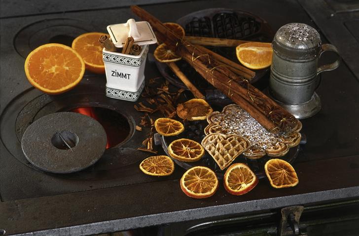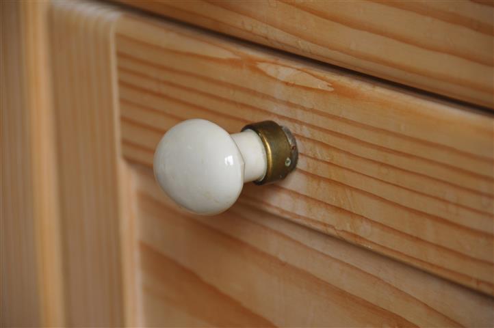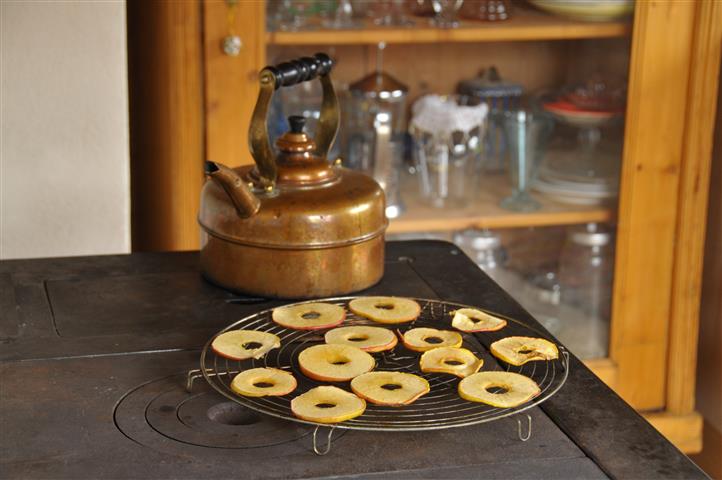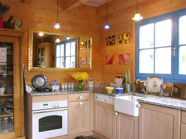 So halten wir es mit unserer gesamten Wohnungseinrichtung. Die schlichte Küchenzeile wird vom Schreiner im Ort nach unserem Plan angefertigt. Sie soll aus Tannenholz sein wie unser 100 Jahre altes Küchenkönsterle und der alte Tannenschrank mit Glastüre. Diese praktischen wie nostalgischen Küchenmöbel werden in die neu gefertigte Holzküche integriert werden. Sogar die Kassettentür des Könsterles wird Vorbild für die massive Holzfront der Küchenmöbel. Zwei Gaskochplatten als Herd sollen uns reichen. Im Herbst und Winter haben wir einen alten Holzherd von DeDietrich noch als zusätzliche Kochstelle in Einsatz. Wir haben ihn aus der Antik-Ofen-Galerie in Burrweiler, Rheinland Pfalz. Ein Kontrast zum Holz ist die kühle Küchenarbeitsplatte aus grau-schwarz meliertem Granitstein. An die Türfronten kommen alte ovale Griffe aus Porzellan, die wir aus England mitgebracht haben. Ähnliche cremefarbene Griffe konnten wir zusätzlich neu bei Manufaktum kaufen. Sie kommen an die Zimmertüren. Auf Oberschränke verzichten wir ganz. Diesen Platz nimmt ein großer Spiegel mit gelbem Rand und goldfarbenen floralen Ornamenten ein, den unser Freund Gregor aus Basel eigens dafür in seiner Rahmengalerie Eulenspiegel angefertigt hat. Er hängt über der Arbeitsfläche und reflektiert so schön das Licht von draußen nach innen. Unsere Wohnküche wirkt hell, ist offen zum übrigen Wohnraum und gemütlich. Kurzum: eine schöne, individuelle und obendrein noch günstige Küche von der Schreinerei Trefzer aus dem Oberdorf Marzell.