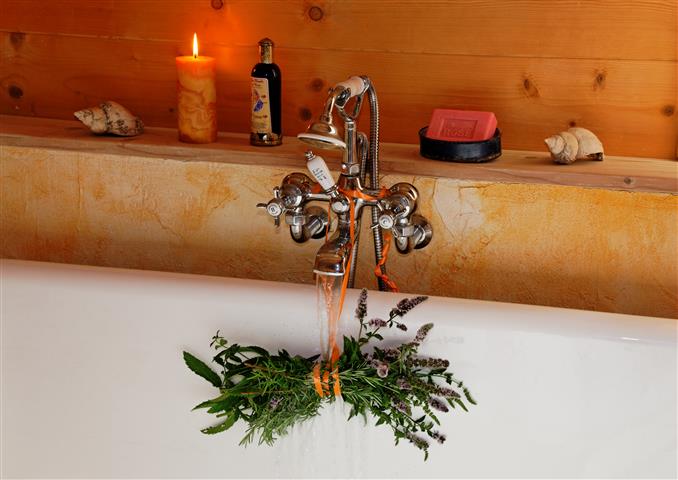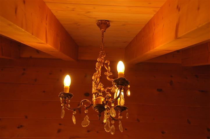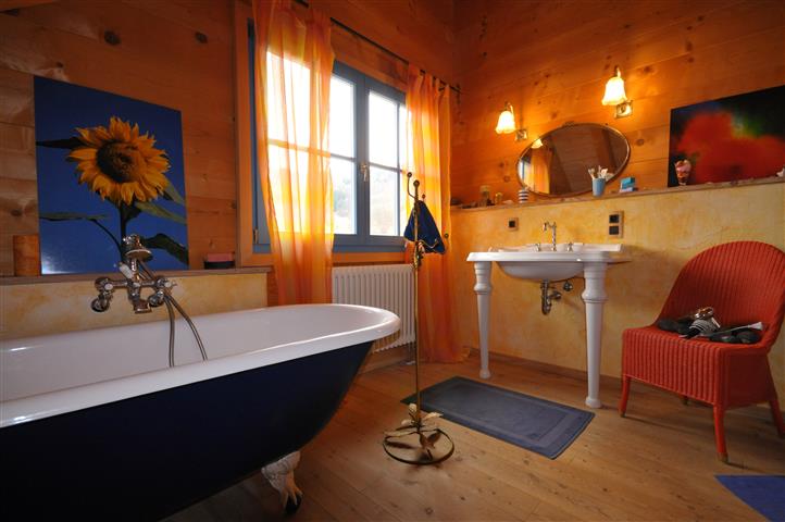 Dafür verzichten wir auf Kacheln im Bad. Wir entscheiden uns für einen Sumpfkalkputz bis auf halbe Höhe rundherum. Er wird auf die Platten des GIS-Systems aufgetragen hinter denen die Wasserleitungen versteckt sind. Der Putz kann Feuchtigkeit aufnehmen und wieder abgeben , reagiert extrem basisch und somit antibakteriell. Genau das richtige für einen Feuchtraum. Früher hatte man die Ställe und auch die Wohnräume in den Bauernhäusern einmal jährlich zur Desinfektion gekalkt. An diese Tradition knüpfen wir mit unserem ausgefallenen Putz an. Wir können ihn selber anrühren und mit einem breiten Spachtel auftragen. Er soll sehr rustikal wirken. Zum Schluss tragen wir auf den empfindlichen weißen Strukturputz mit einem Schwamm eine gelborange Farbe auf. Das Badezimmer erhält so ein mediterranes Flair und ist obendrein gegen Schmutz unempfindlich. Als Deckenleuchte dient ein dreiarmiger Lüster, ein bodenlanger orangefarbener Vorhang kommt vor das große Badfenster. Ich muss sagen, das Badezimmer gefällt mir außerordentlich gut, es ist pflegeleicht und auch unempfindlich gegenüber Schmutz.