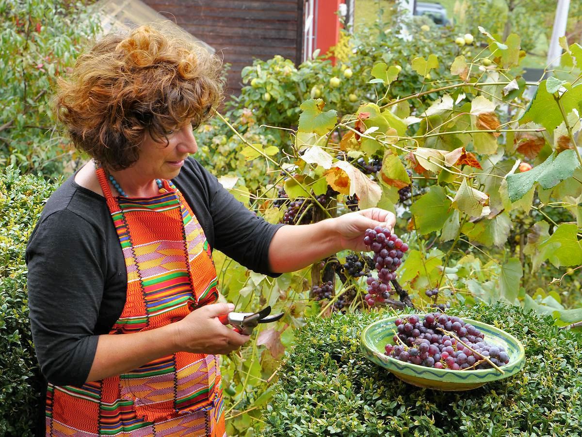 Zwölf Gäste folgten meiner Einladung, für mehr war leider kein Platz, am ausgezogenen Holztisch. Zwei Marzeller musste ich daher absagen, vielleicht ein andermal. Die ersten Hungrigen kamen um 12.00 Uhr, besonders überraschte und freute mich der Besuch meiner Cousine aus Karlruhe, die pünktlich vor der Türe stand. Die letzten kamen um 13.30 Uhr von der Arbeit. Alle hatten Zeit und Appetit mitgebracht. Auf dem Tisch stand frisch gebackenes Fougasse, zwei Aufstriche und Malsburger Quellwasser mit Zitrone. Obwohl alle aus der nahen Umgebung kamen, kannten sie sich überraschenderweise kaum untereinander. Aber gemeinsames Essen verbindet und es wurde munter miteinander geplaudert und sich bekannt gemacht. Spätestens beim Dessert wurden die Plätze getauscht und nochmal interessiert beim Nachbarn nachgefragt. Michael und ich kamen neben dem Bedienen auch zum entspannten Essen in der lebhaften Großfamillie. Zum Abschluß gab es Kaffee und ich pflückte dazu noch Trauben vor der Terrasse. Insgesamt ein sehr gelungener entspannter Nachmittag, wo alle gut gegessen und sich unterhalten haben, wie mir mehrmals versichert wurde. Alle waren sich einig: Das gesellige Miteinander ist nachahmenswert.