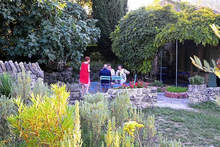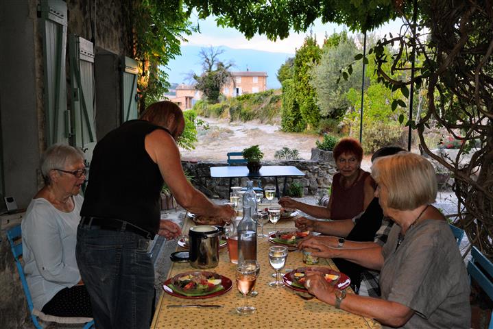 Die Paella ist normalerweise ein Gericht aus Spanien, das in einer großen kreisrunden Pfanne zubereitet wird. Sie schmeckt aber auch in der Provence, besonders wenn sie von Eva so köstlich zubereitet wird. Ich besuchte nun schon zum wiederholten Male  einen Malkurs von Frank Hempel, Eva seine Frau ist für die Kunst in der Küche zuständig und die gute Seele  des Hauses. Es wird nicht nur gemalt und gezeichnet sondern auch sehr gut gegessen. Nach einem Boulespiel  und dem anschließenden Apero zaubert Eva ein dreigängiges mediterranes Menü auf den schön gedeckten Metalltisch unter der Pergola. So geht der Tag in gemütlicher und genussvoller Runde zu Ende genauso wie er begann.