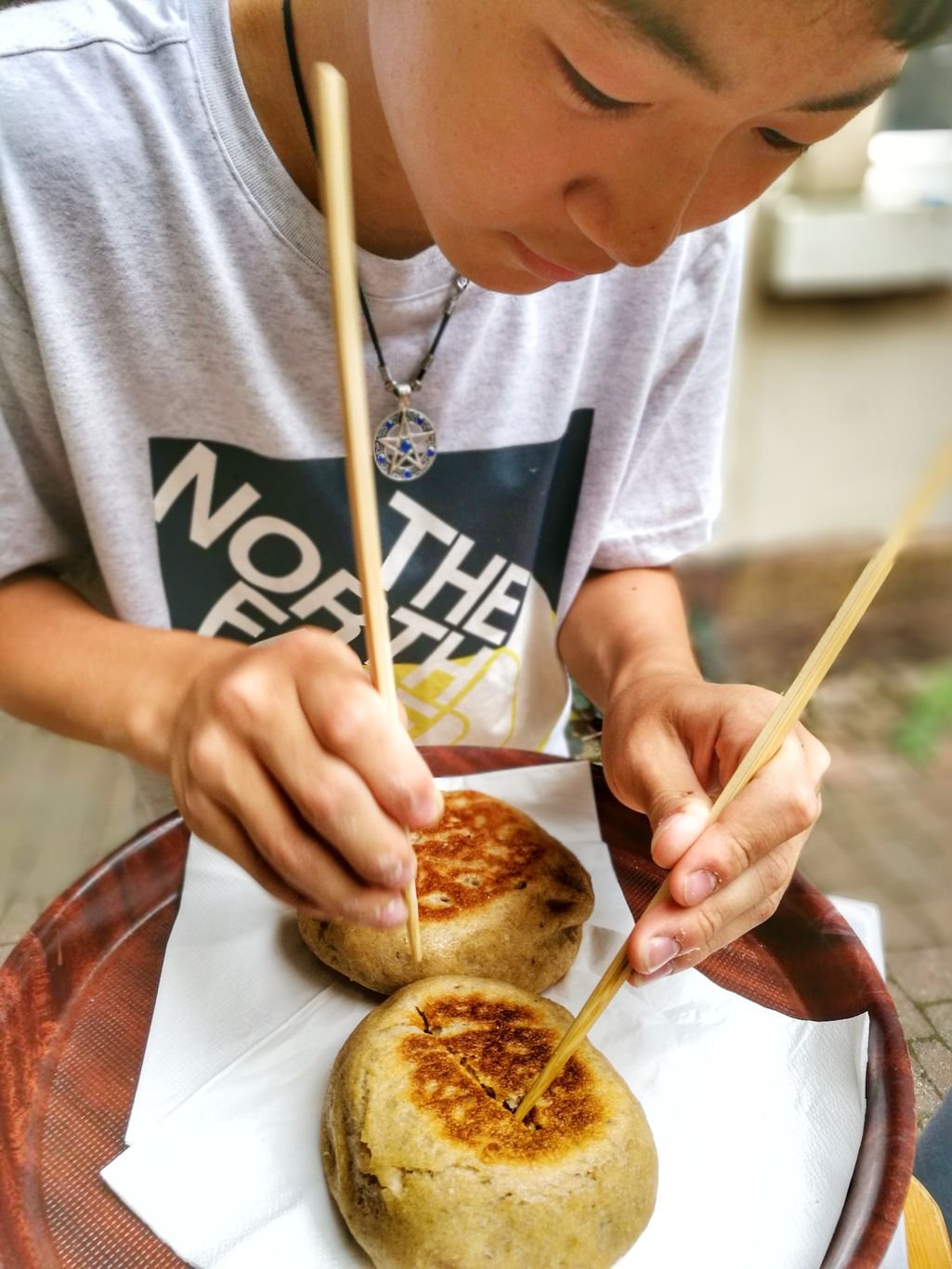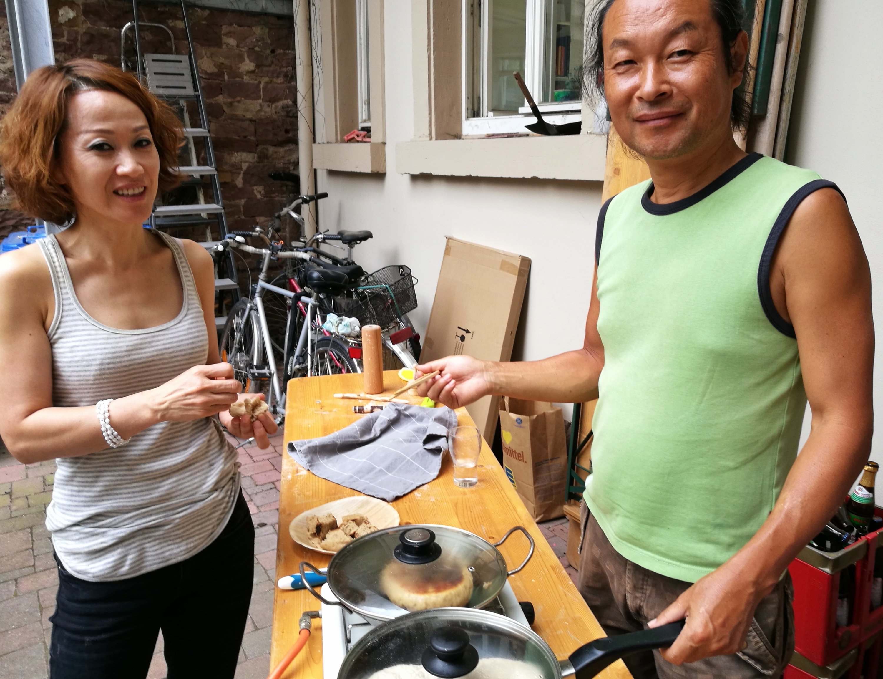 Ein sehr guter Freund von uns, der Galerist und Maler Moon Kwan Park bittet mich, für eine Gruppe koreanischer Austauschschüler einen kleinen Backkurs zu organisieren. Die Artpark Gallery von Moon Kwan Park bietet Raum für aufstrebende und renommierte Künstler und dient als Brücke zum Austausch zwischen asiatischer und europäischer Kunst und Kultur. Da mein Herz schon immer für Völkerverständigung und Austausch von Kulturen schlägt, sagte ich zu und bin mit fertig gebackenem Dinkel-Sauerteigbrot zur Galerie gefahren, um dort deutsches Brot vorzustellen und dessen Herstellung zu zeigen.Ein wenig Kopfzerbrechen bereitet mir im Vorfeld allerdings der fehlende Backofen in der Galerie und auch in der unmittelbaren Nachbarschaft findet sich kein heißer Ofen. Nach Inspiration suchend blättere ich in unserem ersten Backbuch und da finde ich die Lösung: Wir backen mit den Kindern ein Sauerteig Pfannenbrot auf dem Gasgrill. Den Teig dafür bereite ich am Abend vorher aus Roggensauerteig und Dinkelmehl zu. Ich wusste es schon immer, es gibt stets für jeden Anlass, jeden Umstand und jede Gelegenheit ein passendes Brotrezept! Am Backtag setzen wir gemeinsam einen frischen Brotteig an, um das Vermengen und Kneten von Teig zu zeigen. Es ist schon ein tolles Gefühl, in einem schönen Raum voll mit zeitgenössischer Kunst, auf dem Boden sitzend einen Teig zu kneten. Diesen frisch angesetzten Teig werde ich jedoch erst am nächsten Tag zu Hause backen. In der Galerie selbst formen wir die Fladenbrote aus dem über Nacht geruhten Brotteig. Die koreanische Lehrerin Sun Shin übersetzt meine englischen Worte dabei nahezu simultan, hierfür vielen Dank! Moon Kwan und Veronika Ronie, eine tolle Kunsthochschul-Absolventin aus Düsseldorf und Freundin nehmen den Gasgrill im Hinterhof der Galerie in Betrieb. Die Sauerteigbrote der Schüler backen wir gemeinsam in einer Wokpfanne mit Deckel. Die jugendlichen Austauschschüler sind mit Interesse dabei und jeder Schritt wird genauestens foto- bzw. videotechnisch festgehalten. Es war eine wundervolle Aktion, die wir auch gerne auch als Kurs für Erwachsene wiederholen können. Vielleicht finden wir dazu noch einen mobilen Backofen? Seit diesem Backkurs steht für mich fest: Werde ich je einmal HANNAS-Brotstube eröffnen, hängen dort zeitgenössische Kunstwerke an den Wänden. Kunst fördert die Kreativität und dies ist auch eine der Grundlage jedes guten Bäckers!