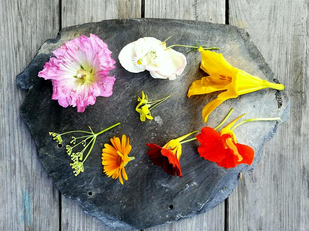 Dieses Jahr sind die Stauden in meinem Kräuterbeet dank Regen und Wärme prächtig gewachsen und stehen in voller Blüte. Ringelblumen, Fenchelblüten, rosa Stockrosen, die zweite Rosenblüte, Kissenkamille, Gänseblümchen, gelbe Taglilie, orangene und rote Kapuzinerkresse. Dazu mit etwas schärferem Geschmack mein flächig blühender Rucola, der auch bei den Bienen sehr beliebt ist.