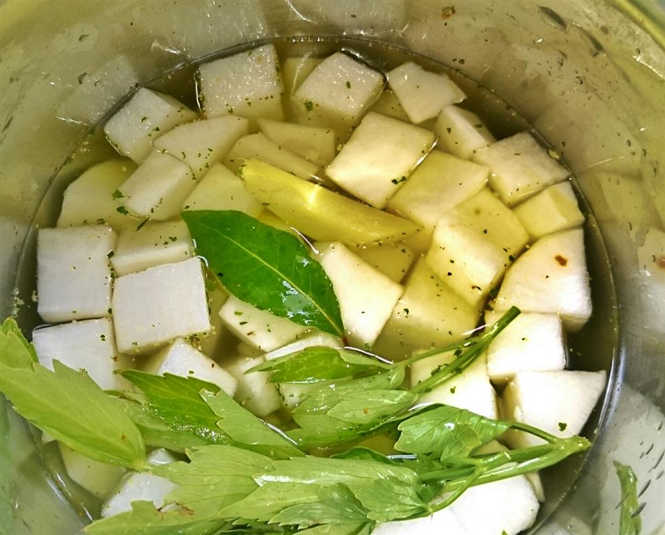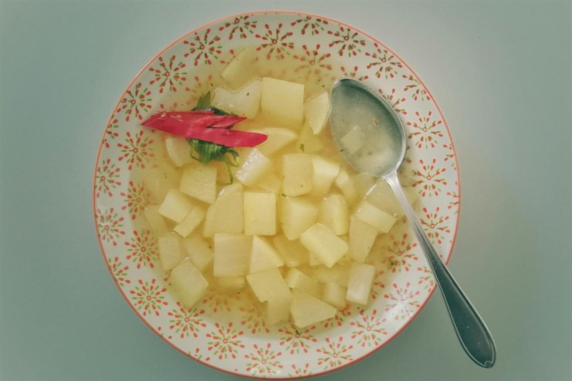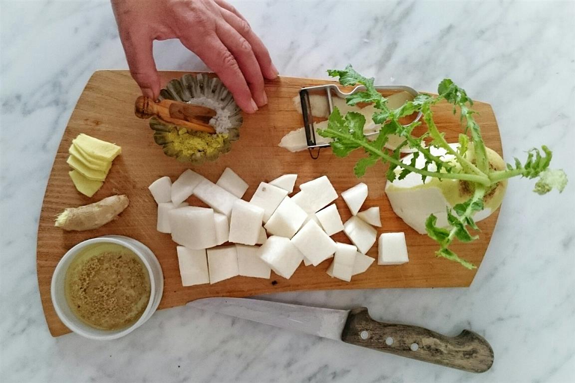 Rettich waschen und in etwa 2 cm große Würfel schneiden (auch gerne etwas kleiner). Den Ingwer waschen und inkl. Schale mit den Rettichwürfeln in einen Topf geben. Soviel Wasser zugeben, dass alle Stücke bedeckt sind. Die Gemüsebrühe und die optionalen Zutaten nach Geschmack hinzufügen und 15 Minuten lang kochen, bis der Rettich weich ist. Falls nötig noch etwas nachsalzen und mit Sesamöl und Essig abschmecken. Den Ingwer vor dem Servieren herausnehmen.