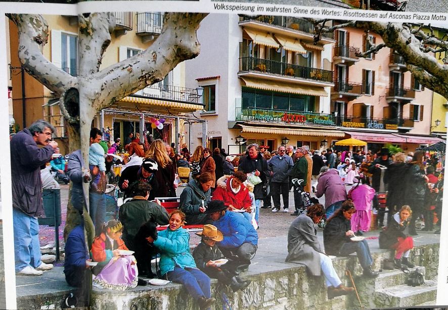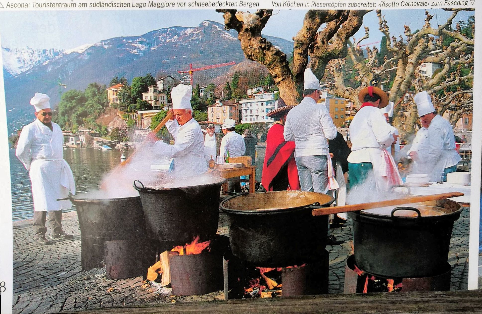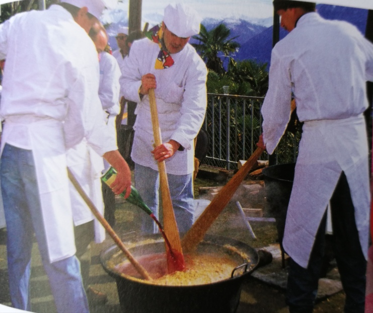 Nicht so im Tessin an Fasching. Hier wird auf öffentlichen Plätzen mit vielen Köchen im Brei also im Reis oder Mais gerührt und zusammen ein Risotto oder eine Polenta zubereitet. Danach wird das Faschingsessen an die Armen verteilt. So will es der alte Brauch, als Reis noch rar und kostbar war und einmal im Jahr an Fasching an die Bevölkerung verteilt wurde. Heute gibt es gratis noch eine Wurst dazu. Es lohnt sich immer ins Tessin zu reisen und besonders an Fasching.
