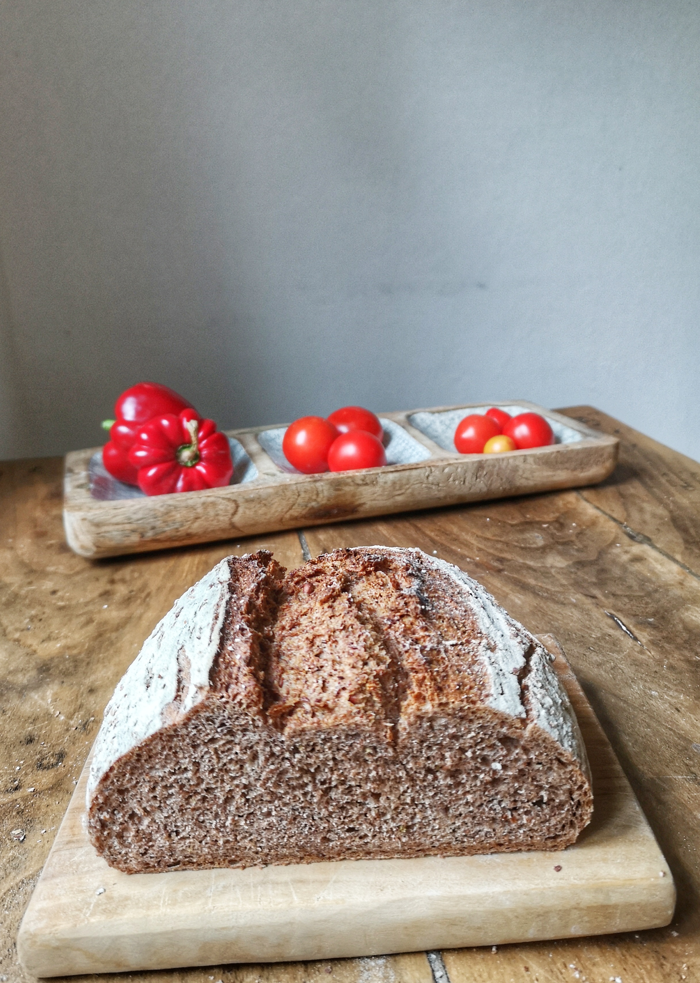 Rotweizen ist eine alte, fast vergessene Weizensorte und wird heute nur noch selten angebaut. Er besitzt die selben Backeigenschaften wie normaler Weichweizen, hat sich aber bei mir in meiner Getreidemühle als hartes Korn herausgestellt. Meine alte Widu Getreidemühle schafft es nicht, die roten Körner zu feinem Mehl zu vermahlen, weshalb der erste Teil der Körner nicht gemahlen, sondern nur geschrotet wird. Dies steht aber ganz im Gegensatz zum Ergebnis: Rotweizen Vollkornmehl bringt ein wunderbar weiches, für ein Vollkornbrot recht fluffiges Brot hervor. Mein Rotweizen hier stammt aus der solidarischen Landwirtschaft Wahlbacher Hof in Zweibrücken. Dies ist für mich die schönste Art, das Mehl für seine Brote aus zu suchen. Meine Kollegin Sina ist dort Mitglied und brachte mir 1,2 kg Körner mit ins Büro, die ich ihr zu 3 Broten verbacken habe. Sina, ich wünsche dir eine schöne Elternzeit und vor allem eine gute Geburt!
