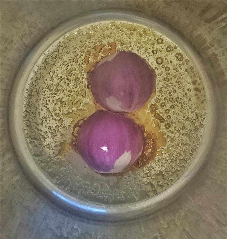 - 1-2 TL Zucker in einem Topf erhitzen und zwei Zwiebelhälften einsetzen. Nun 1-2 Minuten lang karamellisieren lassen bis die Zwiebeln schön braun sind, danach mit 1/2 Liter Wasser ablöschen.